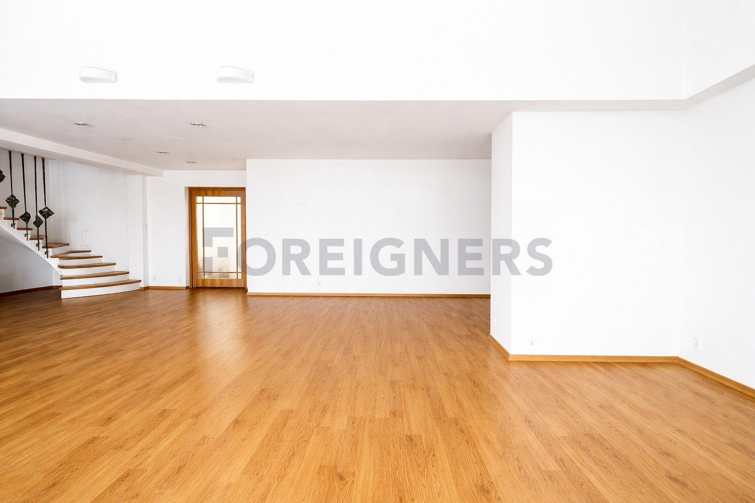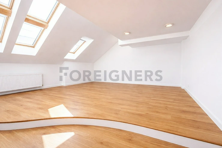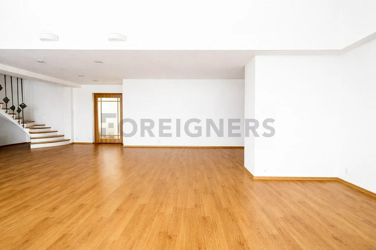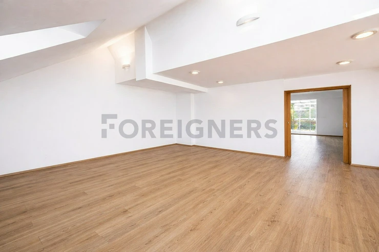 The dominant feature of the apartment is a glazed winter terrace of 19 m², ideal for relaxation with views of the surrounding greenery. Thanks to its position on the top floor and the fact that there are only two apartments per floor, the apartment offers an exceptional level of peace and privacy. The interior is an impressive space with a strong emphasis on light and privacy.