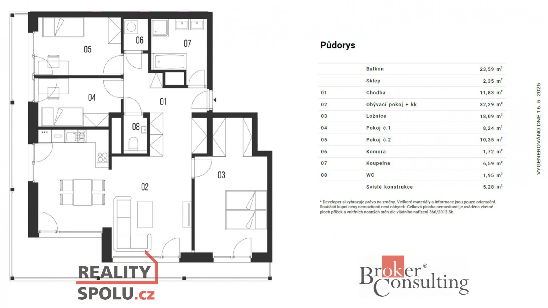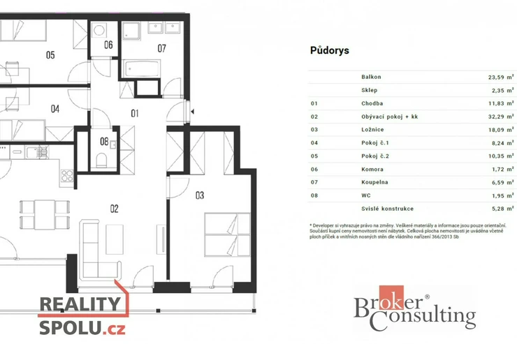 Byt má k dispozici 98,68 m2 plochy bytu (včetně ploch pod svislými konstrukcemi). Zmíněná plocha obsahuje terasu o 23,59 m2 a sklep o velikosti 2,35 m2.