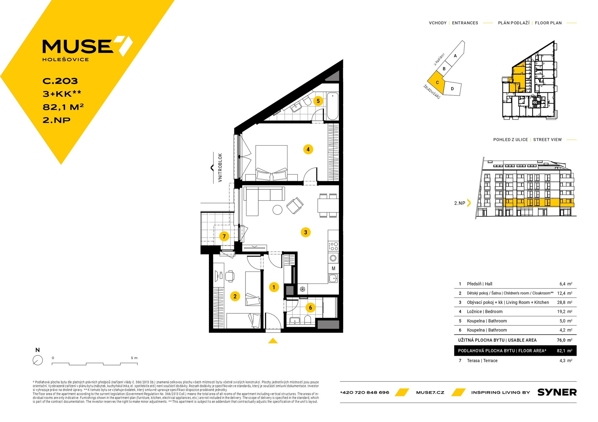 Zajímavě řešený byt o dispozici 3+kk (82,1 m²) s terasou 4,3 m² s orientací na jih do klidného vnitrobloku se nachází ve 2. nadzemním podlaží v nově vznikajícím rezidenčním projektu MUSE7 v pražských Holešovicích. Prostorný obývací pokoj s půdorysem písmene L má směrem do zeleného vnitrobloku velkoformátové okno s dveřmi na malou terasu. Sousední ložnice, také s výhledem do vnitrobloku, je průchozí do koupelny s vanou. V bytě je ještě další místnost s přístupem na terasu, která může dobře posloužit jako dětský pokoj nebo velká šatna. Ze vstupní předsíně se vstupuje do druhé koupelny se sprchovým koutem a WC.