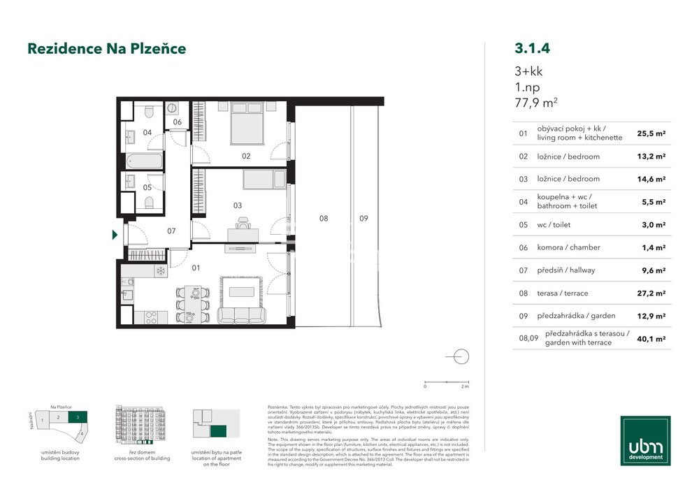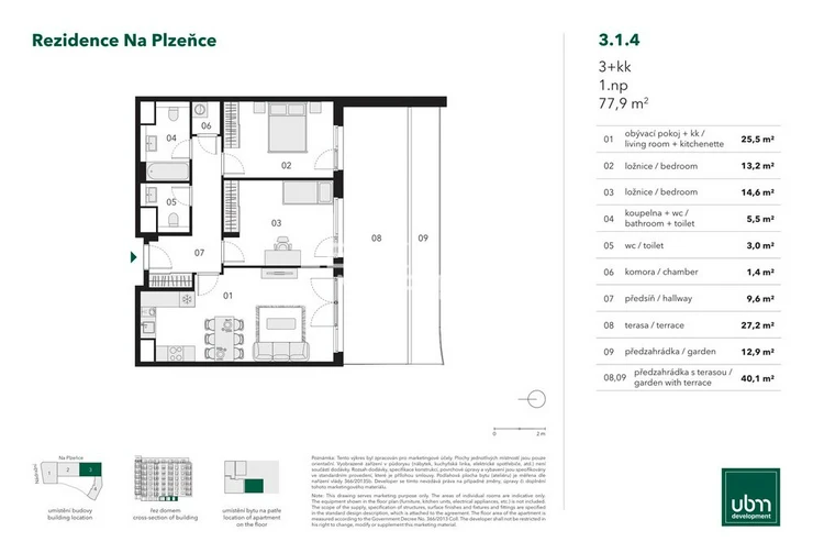 We offer a modern two-bedroom apartment of 77,9 sqm, with a front garden of 12,9 sqm, a terrace of 27,2 sqm and a view of a quiet courtyard. Ideal for a family or couple.The apartment features a spacious entrance that connects the bathroom with a bathtub, a separate toilet. Then a room that can be used as an office or a children's room, and a spacious bedroom. The apartment is characterized by a spacious and bright living room with a kitchen.A major advantage of this apartment is the terrace with a front garden, accessible not only from the living room but also from both bedrooms. This seamlessly connects the interior with the outdoor space, bringing in more natural light and offering the possibility of outdoor seating. The Na Plzence Residence is a modern and ecological residential project in the dynamically developing Smíchov district. It offers 160 apartments with layouts from 1 to 4 bedrooms, high–standard fittings, and class-A energy efficiency (EPC). The project uses geothermal boreholes, heat pumps, and photovoltaic panels, which reduce operating costs and provide efficient heating and cooling. The residence includes a private courtyard with green space, a two-storey underground garage with charging stations for electric vehicles, and facilities for cyclists.Housing in the Na Plzence Residence combines modern style, energy efficiency and excellent accessibility in the dynamically developing district of Smichov. Construction is already underway, with completion scheduled for the year 2027.You can also enjoy large-format windows with wooden frames and insulated triple glazing, which provide plenty of daylight while ensuring excellent thermal insulation.The apartment is equipped with wooden floors, underfloor heating for a comfortable temperature in every season, and external blinds that ensure optimal light control and privacy. Underfloor heating can also replace air conditioning.Smichov is one of Prague's fastest-developing districts and will undergo a significant transformation in the coming years. As part of the revitalisation of the area around the Smichov railway station, a new transport terminal will be built to connect the metro, train station, tram and bus lines with a large P+R car park. At the same time, the railway station is being rebuilt, and a new urban district with offices, shops and public spaces will be created in the area.The Residence is within walking distance of the Smichov railway station, line B metro and tram lines, providing excellent transport accessibility. The proximity to the Vltava River and the Smichov Embankment gives the location an unmistakable atmosphere that combines an urban lifestyle with a pleasant environment for everyday life. There is a wide range of restaurants, cafes, shops, pharmacies and medical facilities in the area.