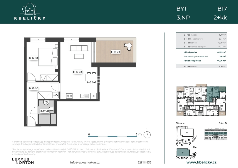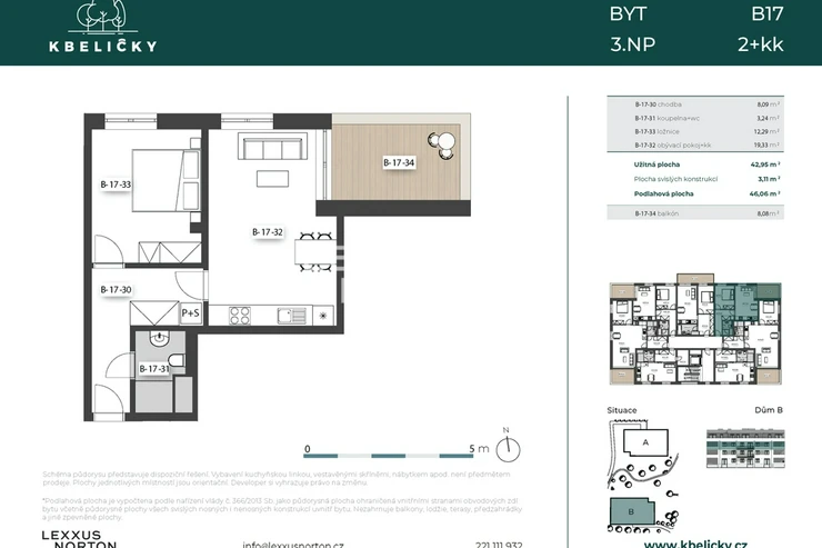 Are you looking for a modern, bright apartment in a quiet and attractive area of Prague 9? We have a unique offer of a one bedroom apartment for sale (46 sqm) with a balcony, which is part of the new residential project Bydleni Kbelicky. An exclusive project offering its residents high-quality facilities with outdoor sports grounds, playgrounds, etc.The apartment is located on the third floor and consists of an entrance hall that takes you to all the main parts of the apartment. The bedroom (12,29 sqm) offers plenty of space and is designed to provide you with maximum comfort and restful sleep. The living room (19,33 sqm) is connected to the kitchen and dining area, creating an open and airy space ideal for spending time with family or friends. One of the main benefits of this apartment is a balcony of 8,08 sqm, accessible directly from the living room. There is also a bathroom, which is equipped with a shower and toilet. The interior of the apartment is bright, spacious and modernly designed. The high quality of the standard and carefully selected materials ensure that you will feel really comfortable here. All details have been designed with aesthetics and functionality in mind, so that your new home is not only beautiful, but also practical. In the basement of the project you will find a room for washing bicycles and dogs, a bike room and a pram room.It is possible to add a parking space and a cellar to the apartment, which are not included in the price.The attractive location of Prague 9 - Kbelicky is characterized by rich nature, picturesque forest parks and bike paths. Within walking distance is the Letnany metro station and the Kbely railway station. The planned new electric bus route will also make daily commuting easier. For active relaxation in nature, you can use, for example, the Letnany Forest Park, the Kbely Central Park and the Klicovske sady. Nearby are shopping centers, restaurants, sports grounds, kindergartens and elementary schools, and medical care, which provides all civic amenities.