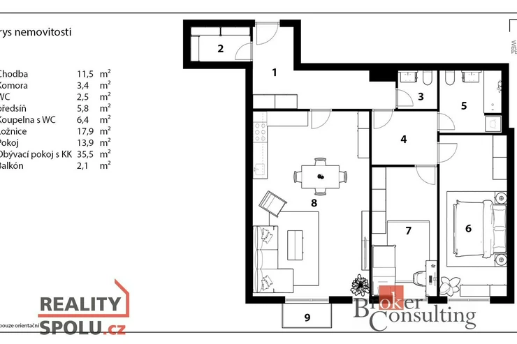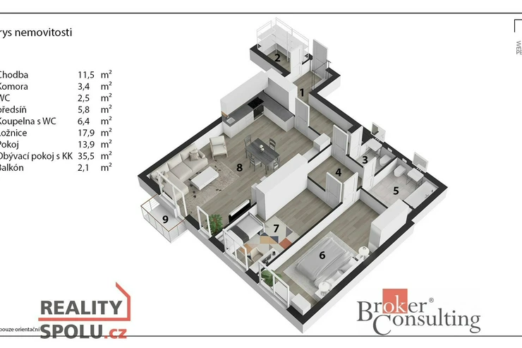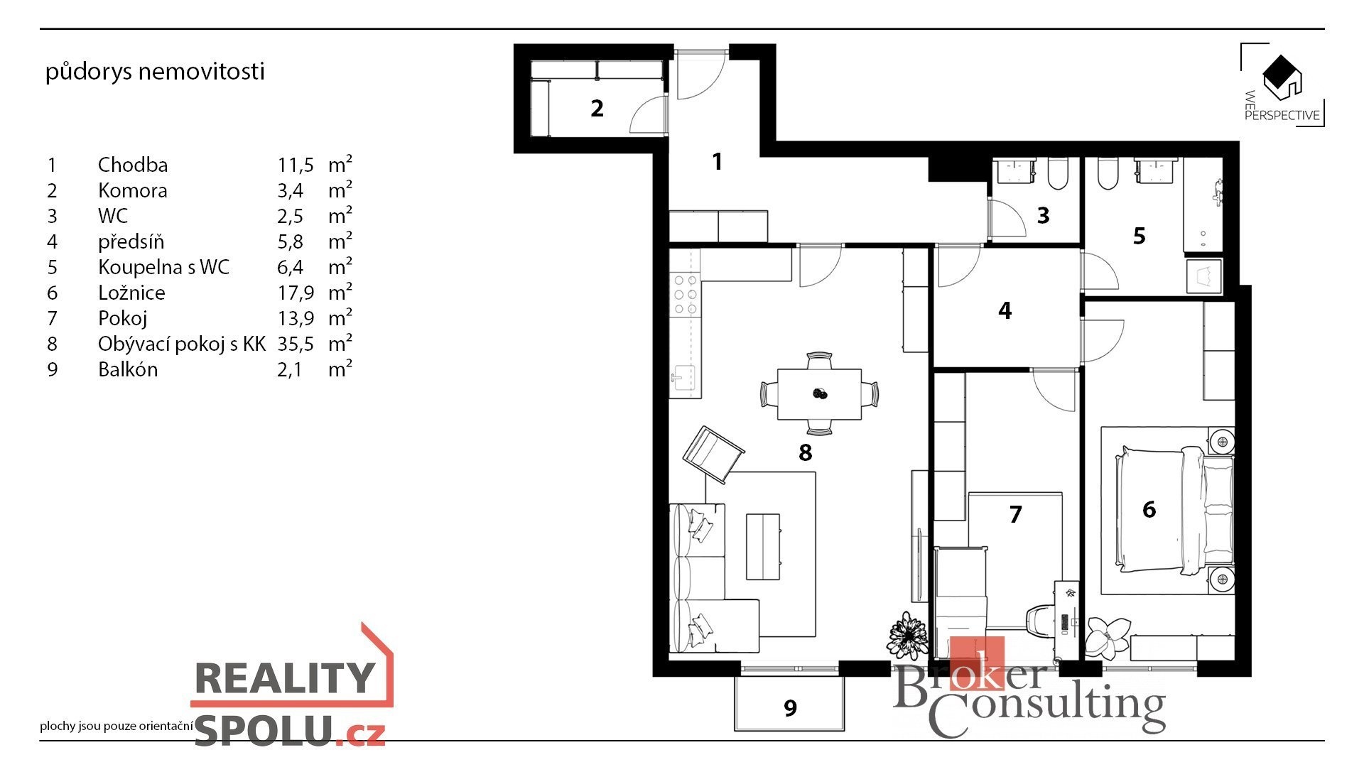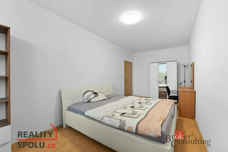 Byt o celkové výměře 107 m² nabízí komfortní dispozici: hlavní obytný prostor propojuje kuchyňský kout, jídelnu a obývací část, ze které je vstup na balkon. Dále jsou zde dvě samostatné místnosti – ložnice a pokoj, koupelna s toaletou, samostatné WC, úklidová komora a prostorná vstupní chodba.