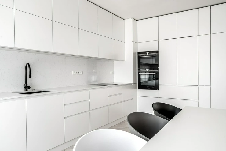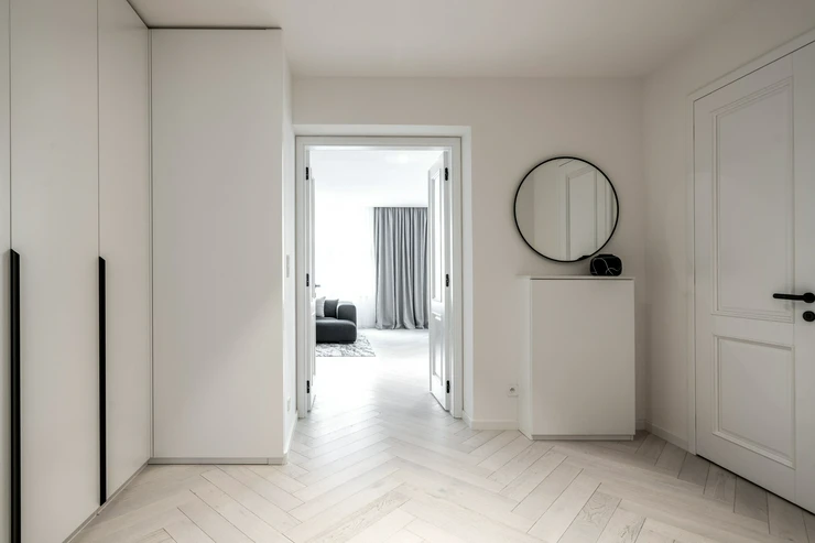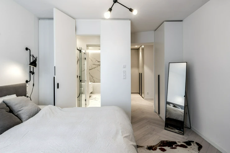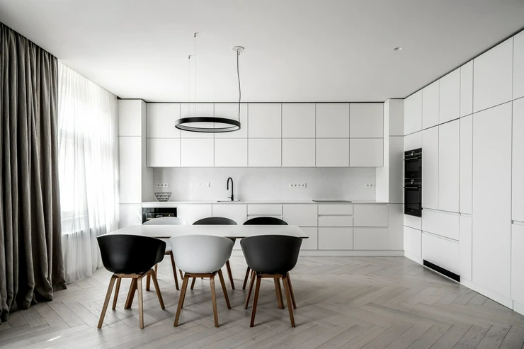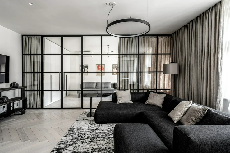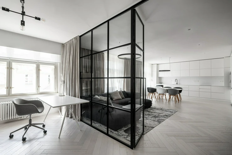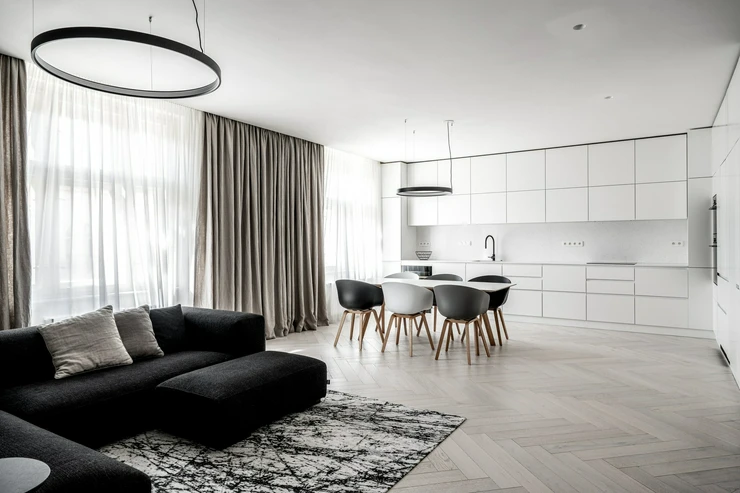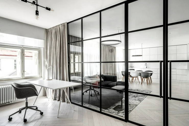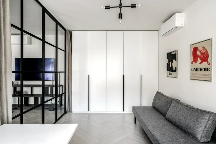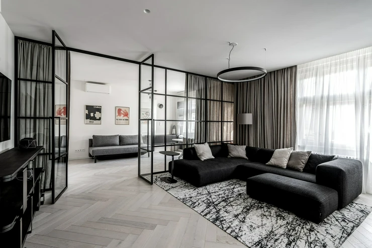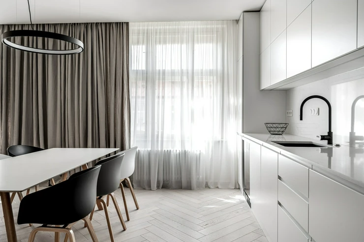 The apartment, with a total area of 155.5 sqm, is characterised by its sophisticated layout and generous space. It is dominated by the main living area with a fully equipped kitchen and dining area of almost 47 sqm This central zone forms the natural heart of the apartment and connects the individual living rooms. The master bedroom faces the quiet courtyard and has direct access to the 2.1 sqm balcony. The second bedroom has an area of 17.4 sqm and offers plenty of space for privacy and comfort. The third room of 13.1 sqm is separated by a glass partition and can be used as a study, guest room or additional bedroom according to individual needs.