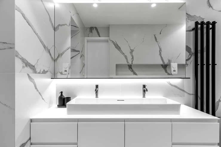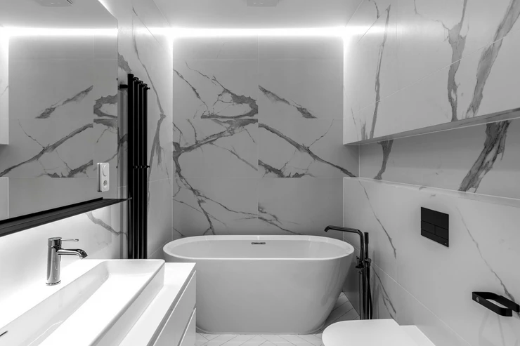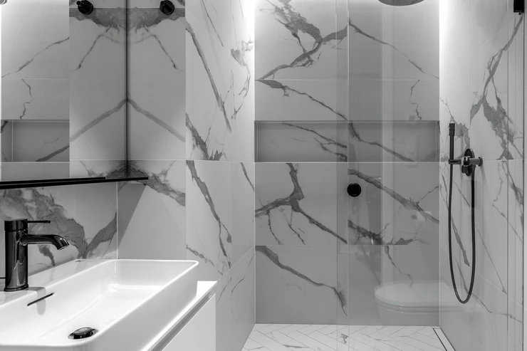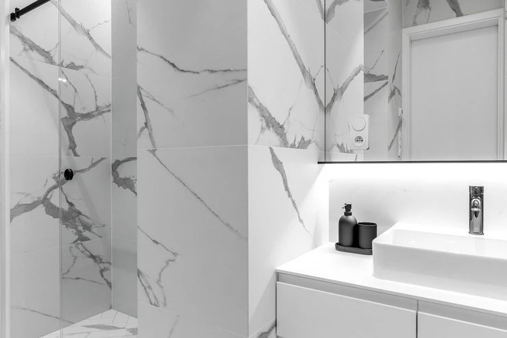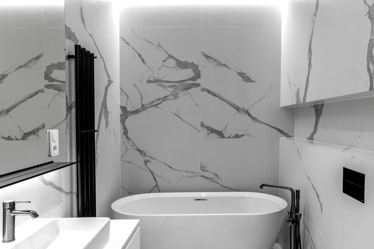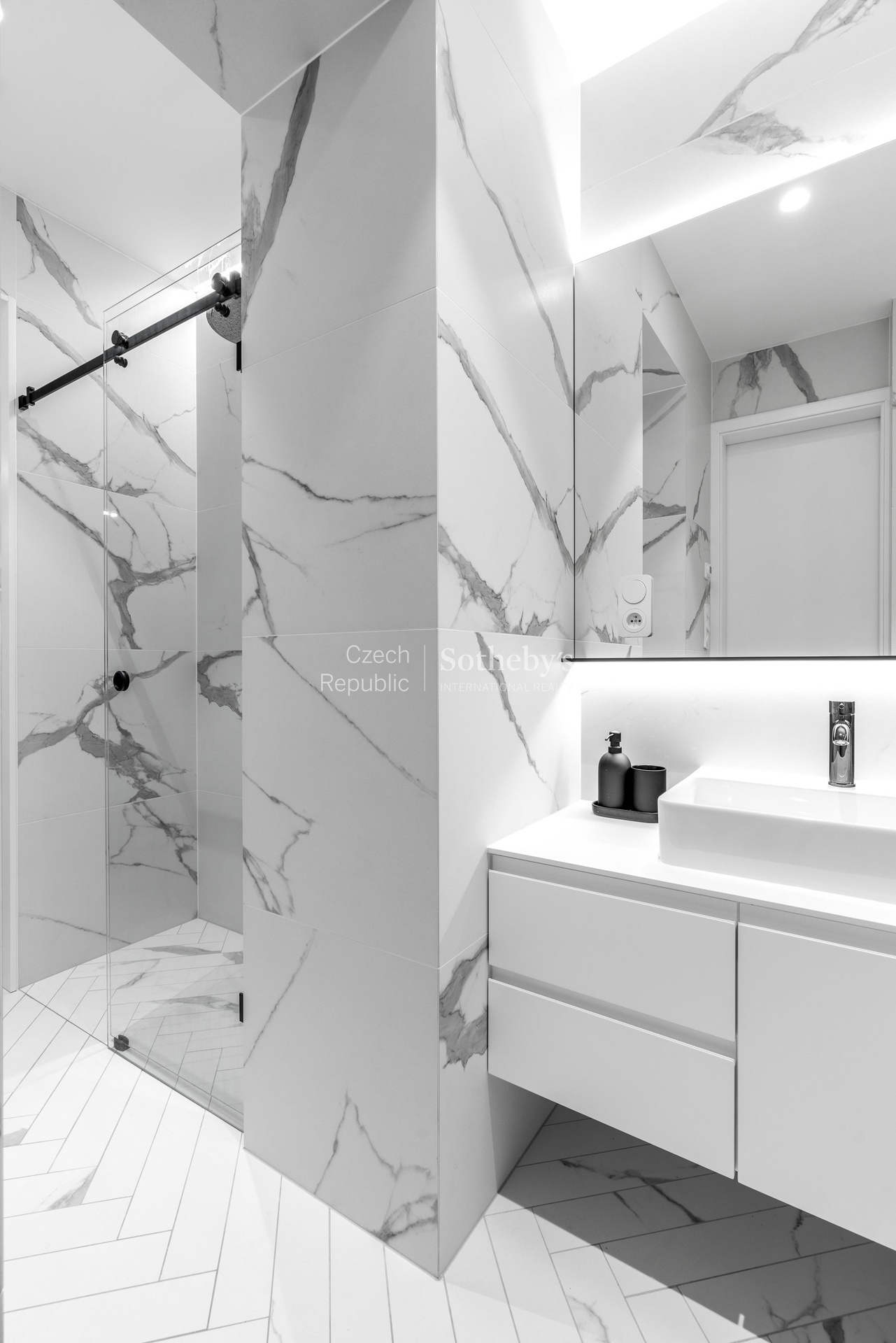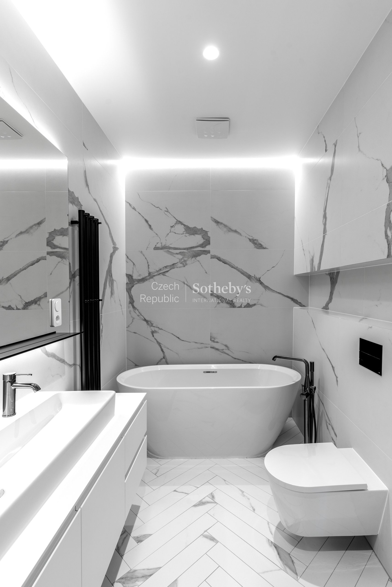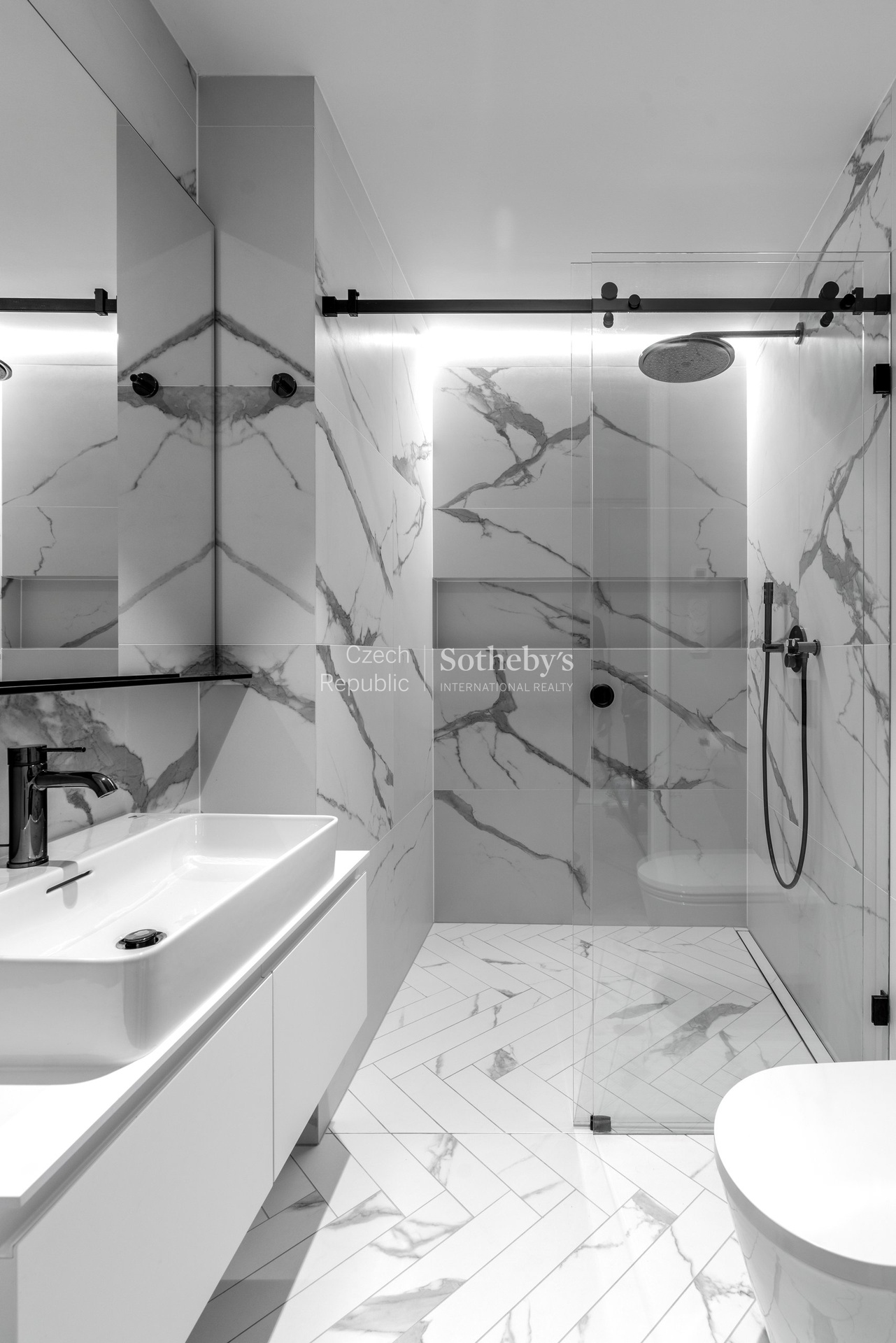 The apartment is equipped with two modern bathrooms. One of them is equipped with a bathtub and shower, the other with a large shower. There is also a separate guest toilet and a practical utility room with preparation for a washing machine and dryer.