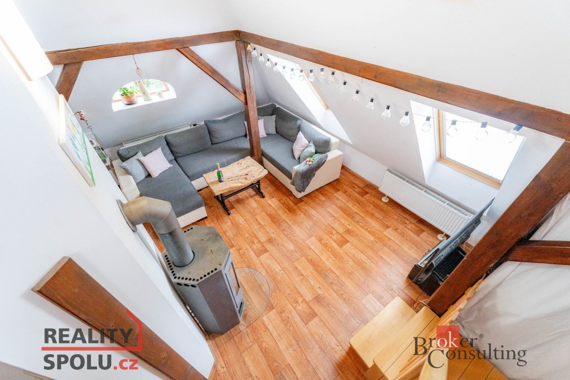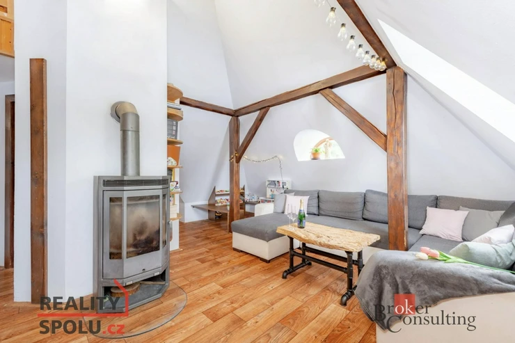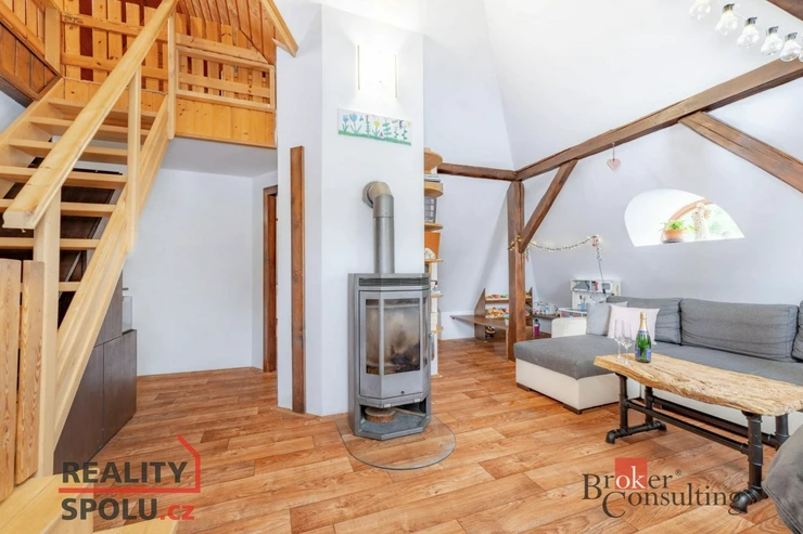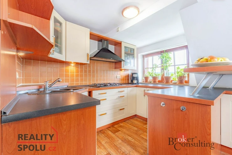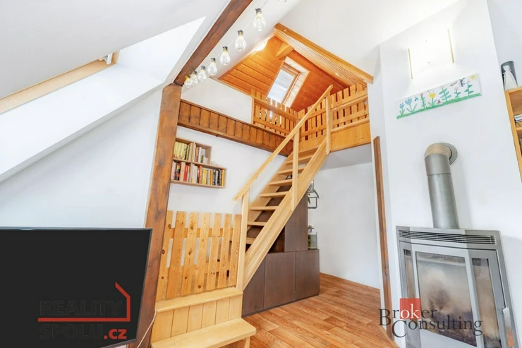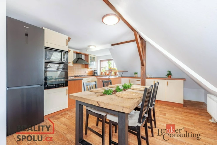 Byt je velmi útulný, teplý, s menšími pokojíky. Ve větší koupelně je rohová vana i sprcha, wc a místo pro pračku. V prostorné kuchyni je moderní kuchyňská linka do U s vestavnými spotřebiči (myčka, digestoř, horkovzdušná trouba, mikrovlnná trouba, plynová varná deska) a dostatek prostoru pro jídelnu. Otevřený menší obývací pokoj pro příjemné posezení stačí, z obývacího pokoje vedou schody do menší otevřené ložnice v patře. V bytě je dále samostatný pokojík, nyní využívaný jako dětský pokoj.