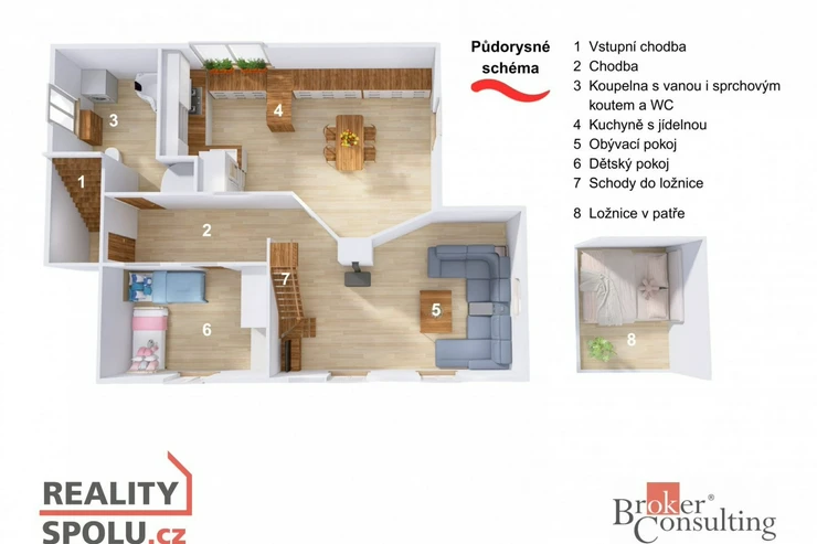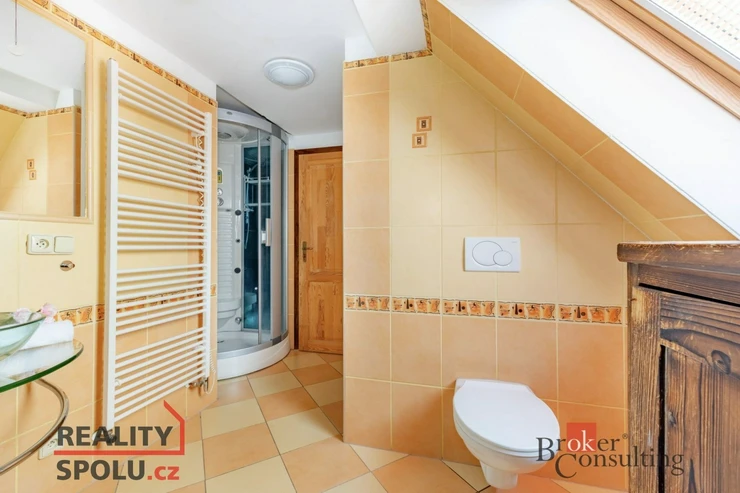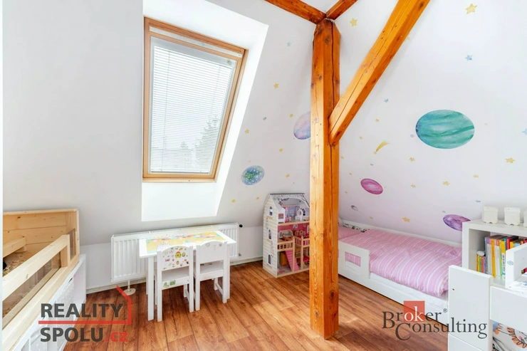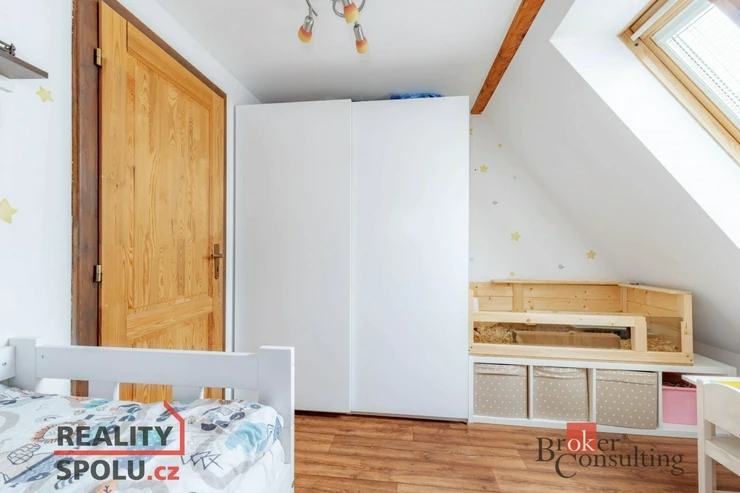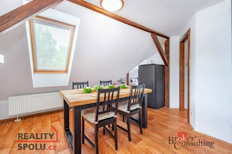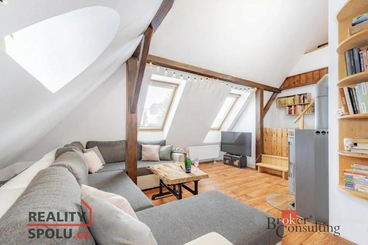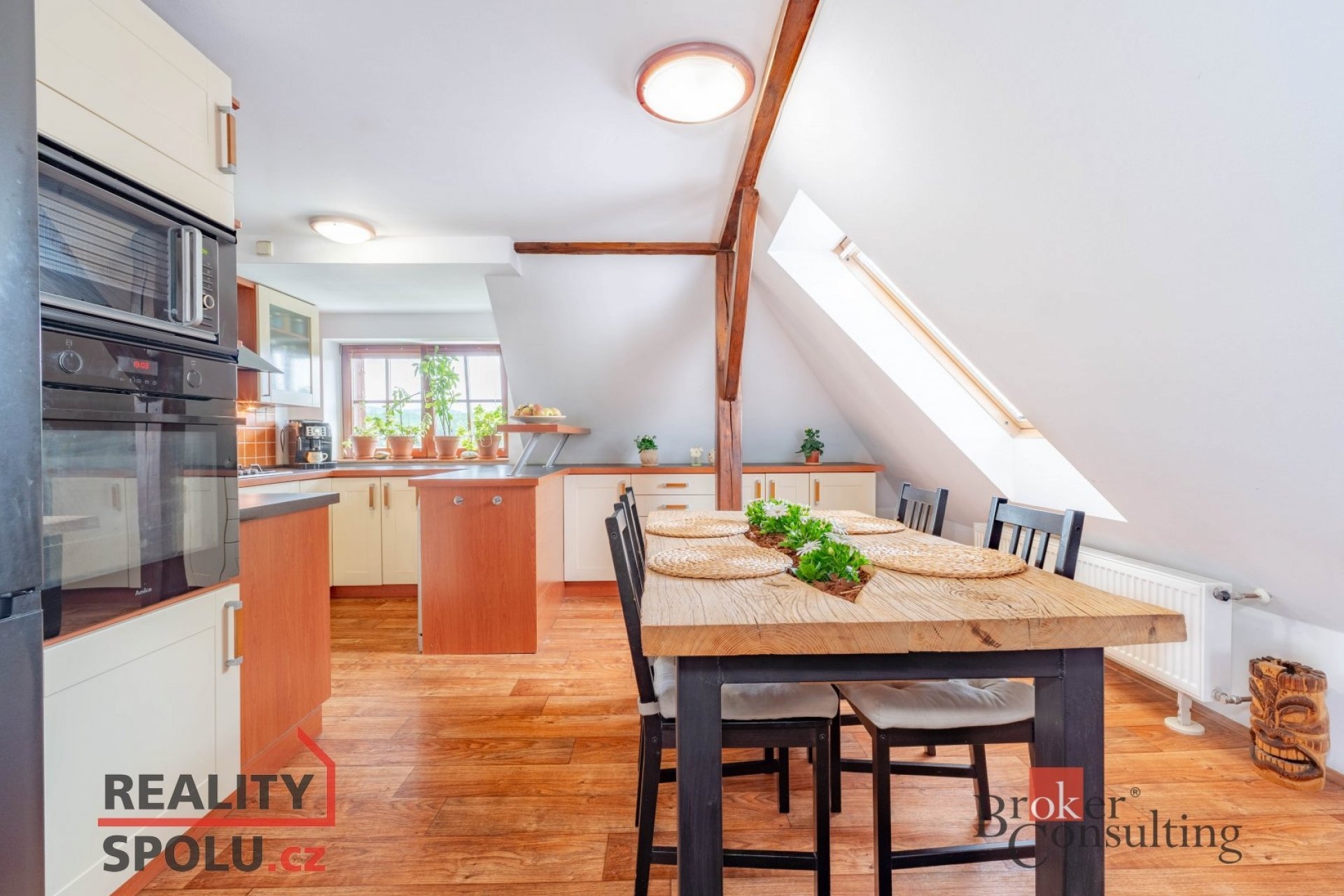 Byt je velmi útulný, teplý, s menšími pokojíky. Ve větší koupelně je rohová vana i sprcha, wc a místo pro pračku. V prostorné kuchyni je moderní kuchyňská linka do U s vestavnými spotřebiči (myčka, digestoř, horkovzdušná trouba, mikrovlnná trouba, plynová varná deska) a dostatek prostoru pro jídelnu. Otevřený menší obývací pokoj pro příjemné posezení stačí, z obývacího pokoje vedou schody do menší otevřené ložnice v patře. V bytě je dále samostatný pokojík, nyní využívaný jako dětský pokoj.