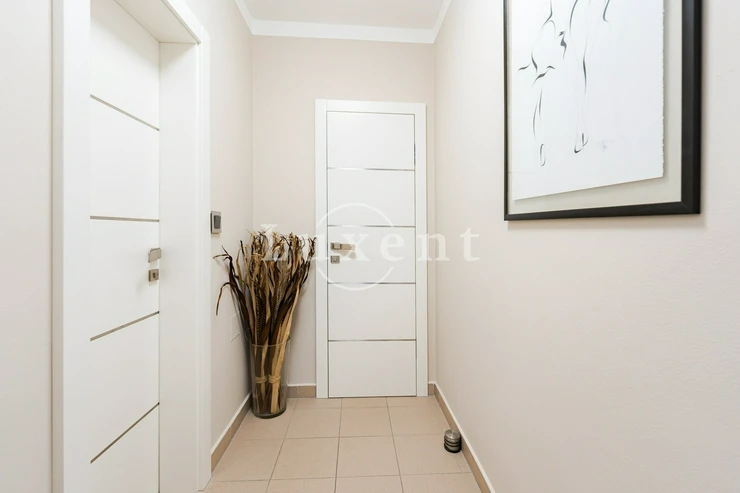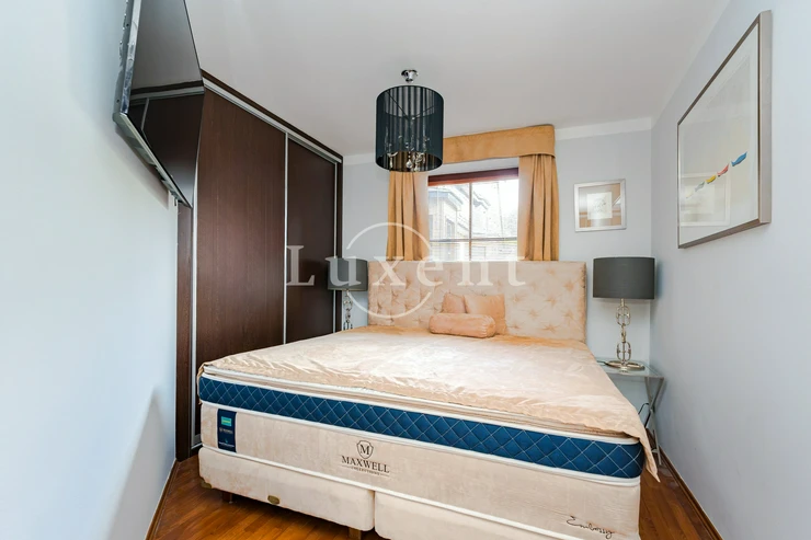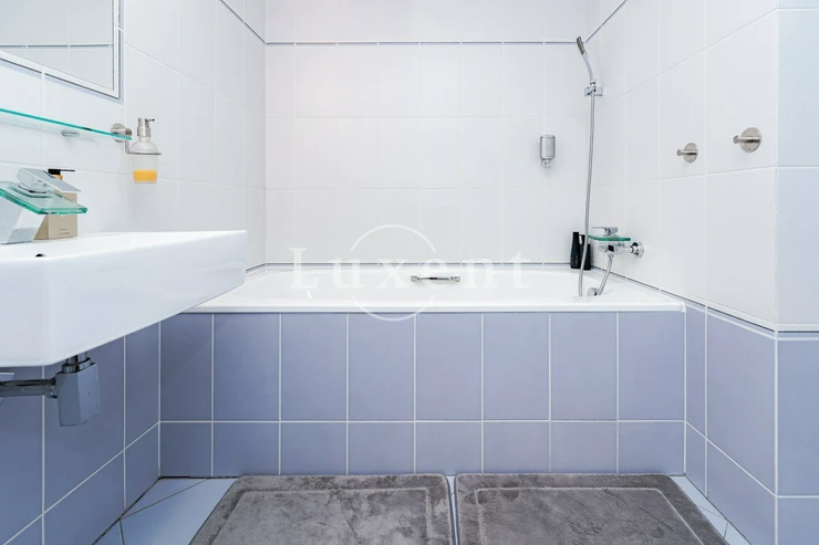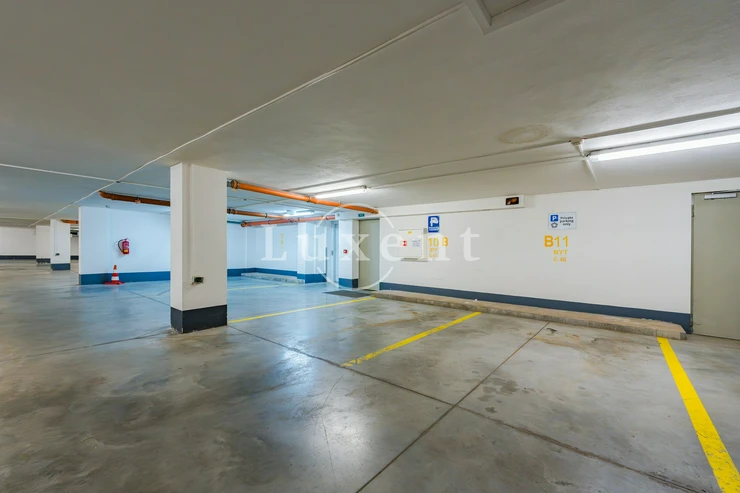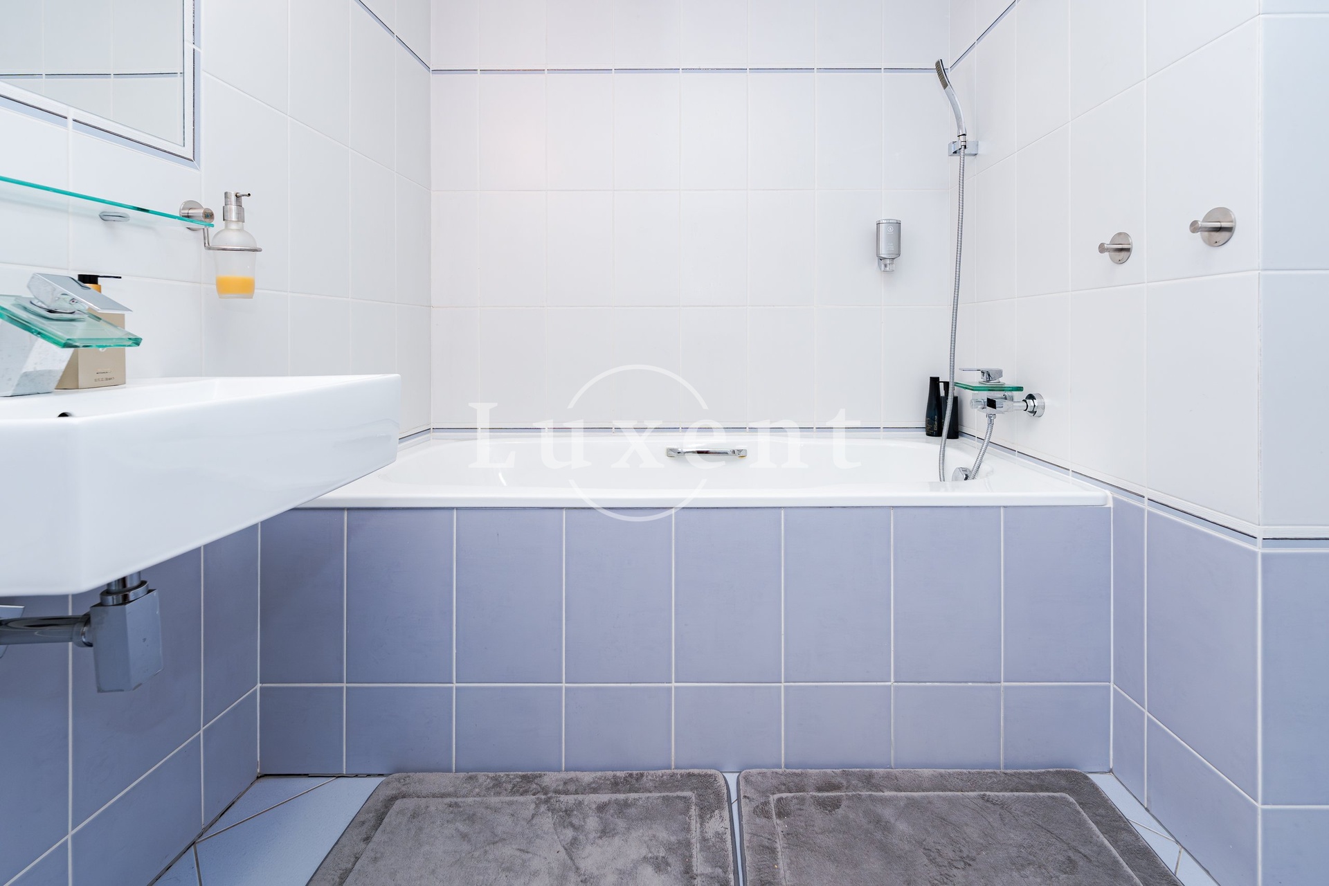 The apartment includes a parking space in the underground garage and a cellar. The layout includes a living room with a sofa bed, a kitchenette equipped with all appliances, a bedroom with a double bed, a bathroom with a bathtub and sink, and a separate toilet. The apartment is sold fully furnished to a high standard. Built-in storage space. High-quality Quantum bed. Terrace with outdoor seating and barbecue. The bathroom includes a washing machine and dryer.