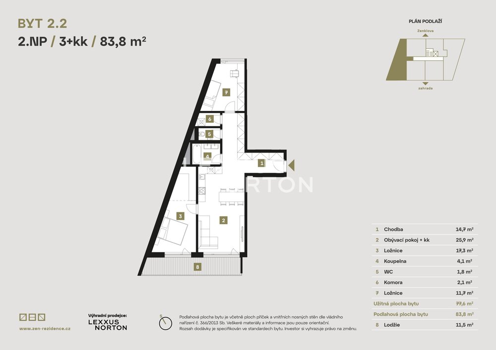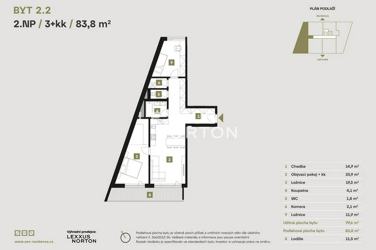 We offer a unique two-bedroom apartment with a total area of 83.8 sqm, located on the second floor of the new residential project ZEN Rezidence in an attractive location in Prague Liben. This apartment, with a sophisticated layout and a spacious loggia (11.5 sqm) facing a quiet courtyard, is ideal for family living.The apartment welcomes you with a spacious entrance hall (14.7 sqm) featuring plenty of storage space, leading to the central part of the apartment – the living room connected to the kitchen and dining area (25.9 sqm). The living room opens onto the loggia, which is the perfect place to relax. The master bedroom (17.3 sqm) is adjacent to the living room and has direct access to the loggia, while the second bedroom (11.7 sqm) is located on the opposite side of the apartment, ensuring ample privacy for all household members.The apartment includes a bathroom with a bathtub, a separate toilet, and a practical storage room. Designed with an emphasis on functionality and comfort, it is situated in the peaceful surroundings offered by ZEN Rezidence.The apartment is finished to a high standard, including wood-look vinyl flooring, premium large-format tiles, and amenities from renowned brands SAT and GROHE. Aluminum triple-glazed windows provide excellent thermal and sound insulation, while electric external blinds and controlled ventilation with heat recovery contribute to overall comfort. Class 3 security entrance doors ensure maximum safety. The apartment comes with a parking space and a basement cubicle on the underground floors.ZEN Rezidence is a unique project that combines modern architecture, functionality, and comfort for superior living. The residence features representative common areas, a carriage house, and bike washing facilities, all contributing to an enhanced living experience.Liben is an ideal neighborhood for those seeking excellent access to the city center and a tranquil environment. The Palmovka metro station and tram lines can take you to the heart of Prague within 10 minutes. In the vicinity of the residence, you will find complete civic amenities – schools, kindergartens, Bulovka Hospital, sports centers, restaurants, cafes, and shops.Nature lovers will appreciate the proximity of Pod Korabem Park, Prosecke skaly, or magical walks along the Vltava Embankment.If you are looking for modern living in an attractive location, ZEN Rezidence is the right choice.