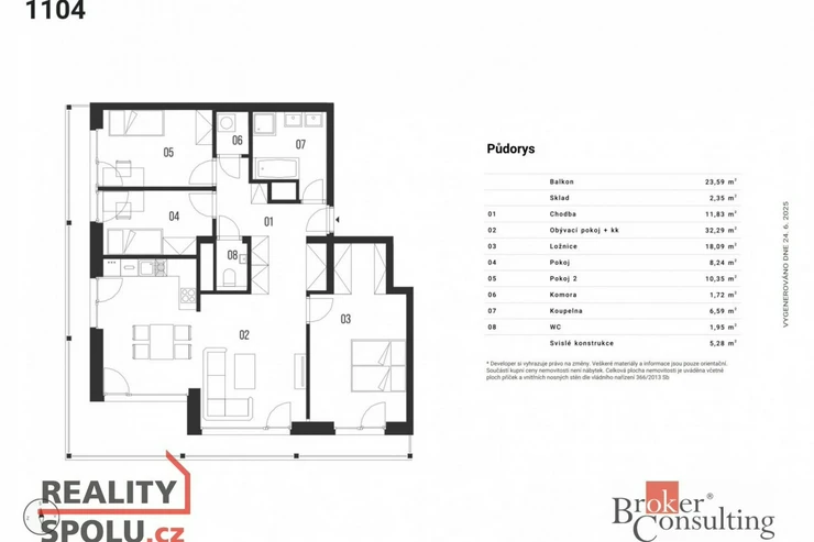 Byt má k dispozici 98,69 m2 plochy bytu (včetně ploch pod svislými konstrukcemi). K bytu náleží terasa o výměře 23,58m2 a sklep o výměře 2,35 m2.