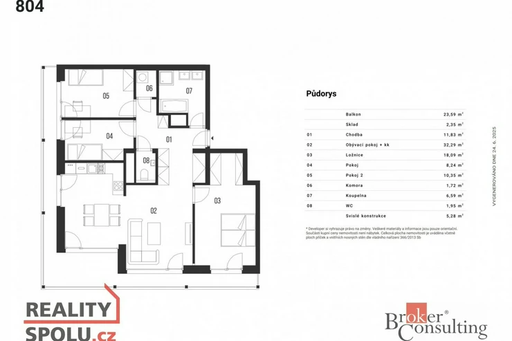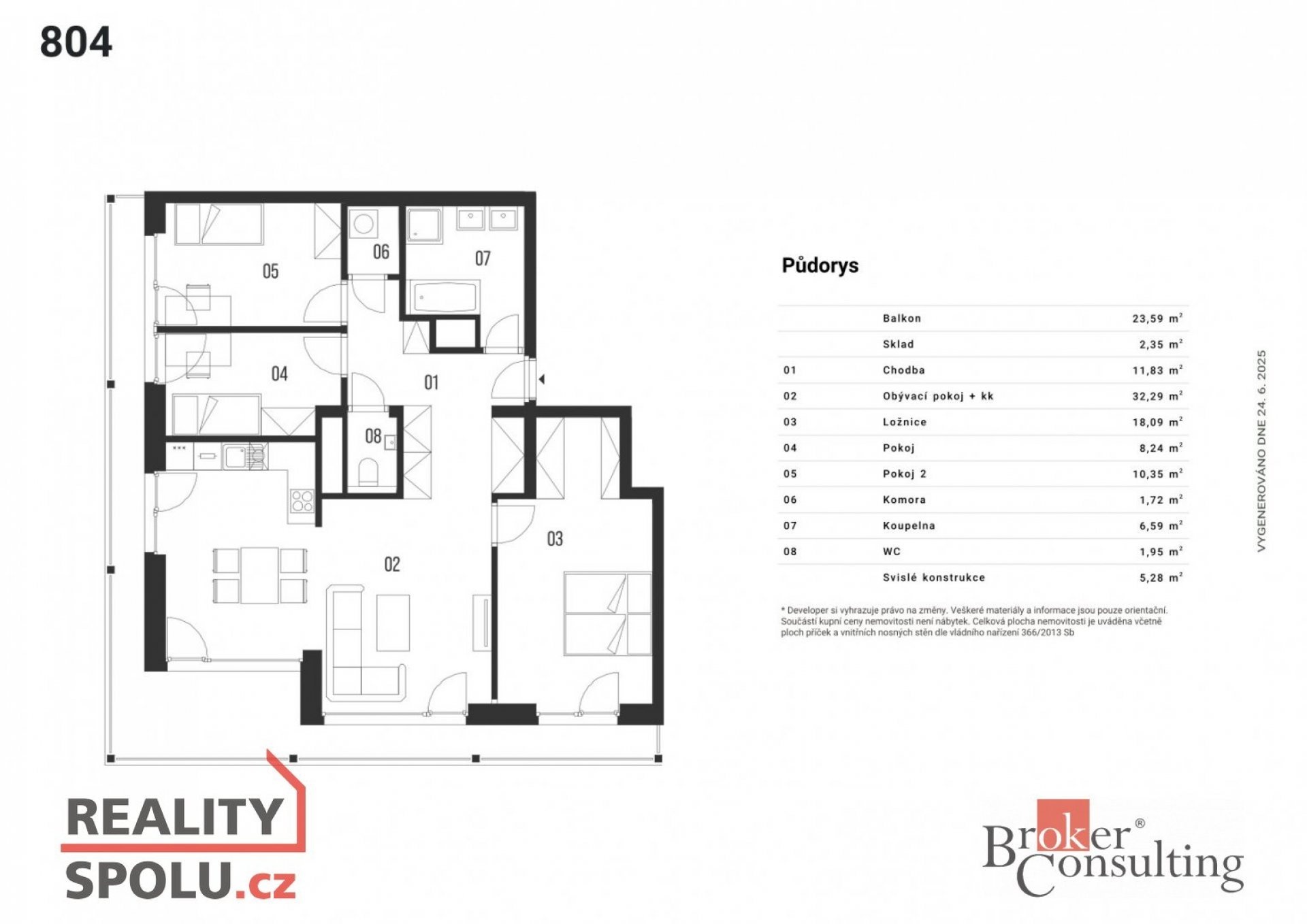Byt má k dispozici 98,68 m2 plochy bytu (včetně ploch pod svislými konstrukcemi). K bytu náleží terasa o výměře 23,58m2 a sklep o výměře 2,35 m2.