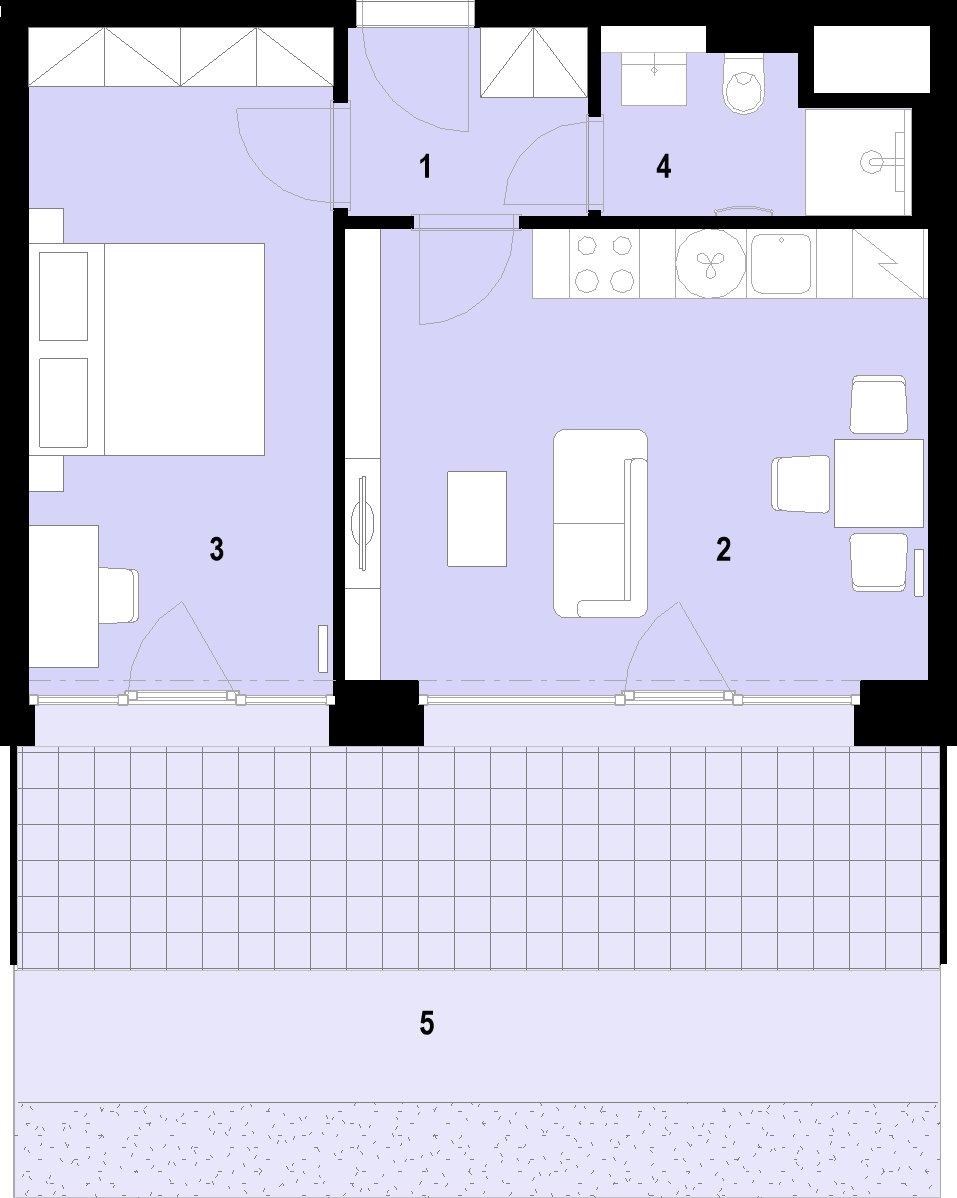 Unit no. 1103 with a one-bedroom layout and a total area of 74.6 m² on the 1 floor will offer you a harmonious space for living, whether you are looking for your own apartment or are a couple starting a joint chapter. The airy living room with a kitchenette freely flows into the bedroom, which is complemented by an elegant bathroom with a shower and toilet. Thanks to its orientation to the S, the apartment enjoys an ample amount of natural light. The unit includes a front garden, perfect for enjoying your morning cup of coffee in the fresh air or growing herbs. A cellar and a parking space must be purchased for each unit. The apartment will be ready to move into immediately with finished floors, a fitted bathroom, and a space for a kitchen unit. Standards include high quality materials, triple-glazed windows, and in selected units, preparation for outdoor shading.