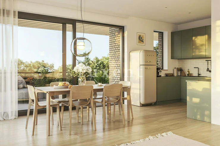 The apartment is situated in 1st floor of a new building, the interior includes a hallway, a spacious living room with a kitchenette and a dining area, a bedroom, another room that can serve as a study, a children's room or another bedroom, a bathroom with a bathtub and a separate toilet. From the living area there is access to the balcony with a beautiful view of the surroundings. The apartment is oriented to the NE side. The apartment has a cellar and there is a possibility to buy a garage.