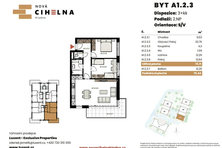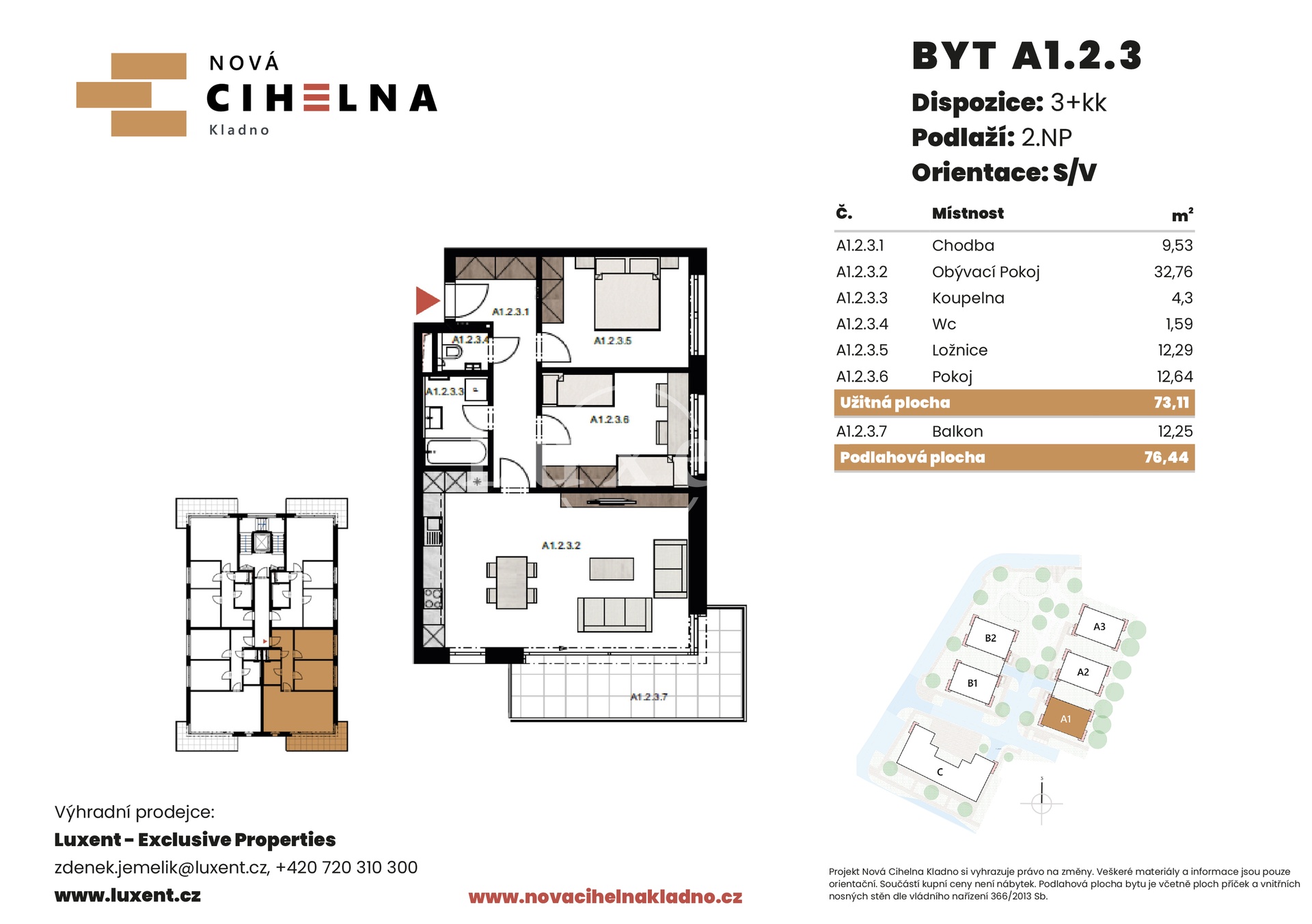We offer for sale apartment 3+kt with a floor area of 76.44 sqm with a balcony of 12.25 sqm in an extremely economical development project Nová Cihelna Kladno arising in the urban area of Kladno - Rozdělov.
