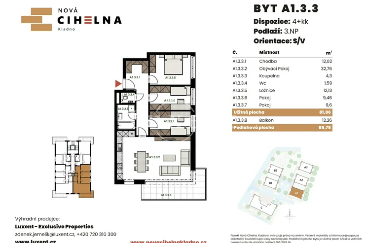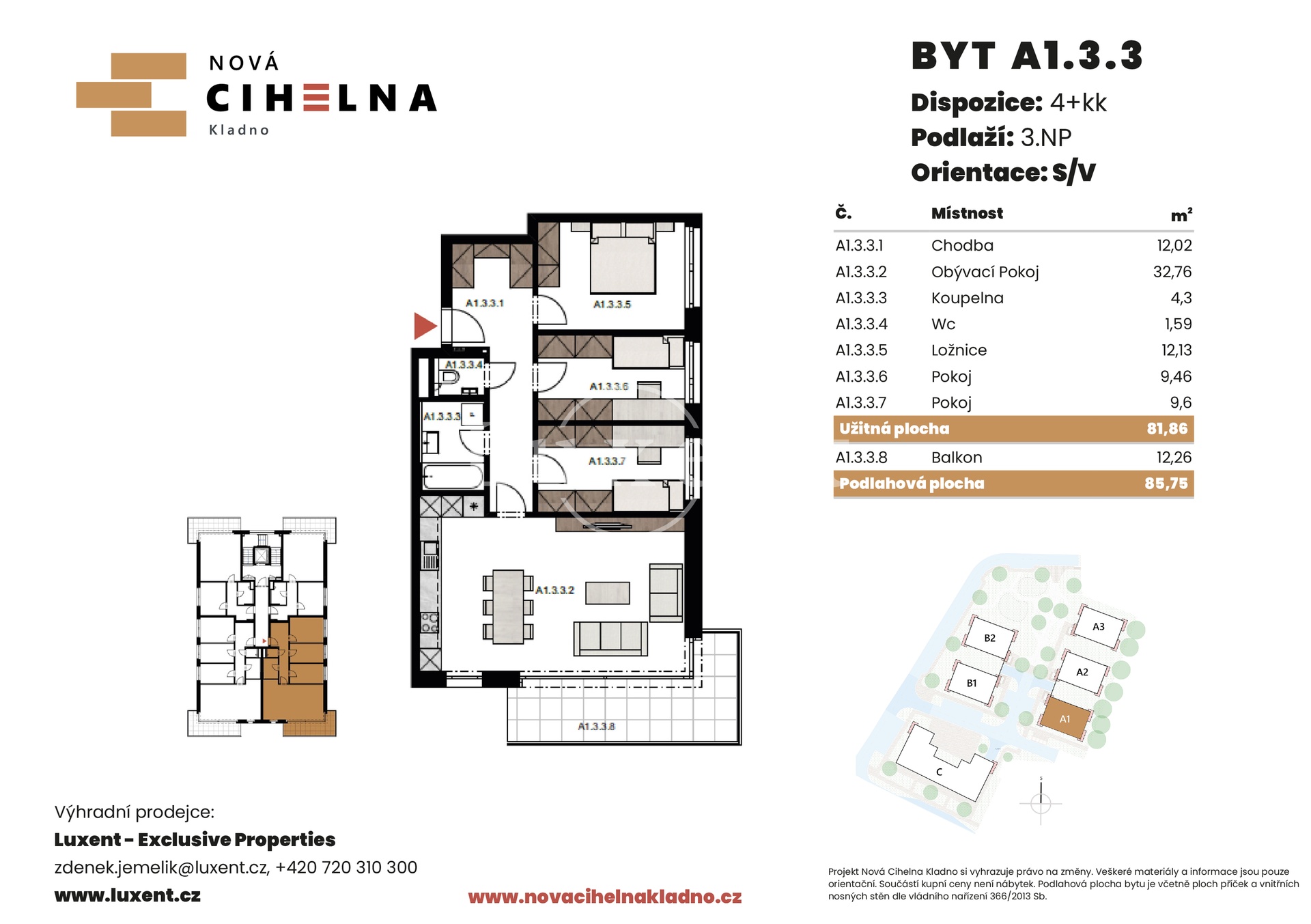 We offer for sale apartment 4+kt with a floor area of 85.75 sqm with a balcony of 12.26 sqm in an extremely economical development project Nová Cihelna Kladno arising in the urban area of Kladno - Rozdělov.