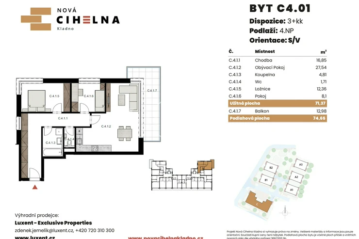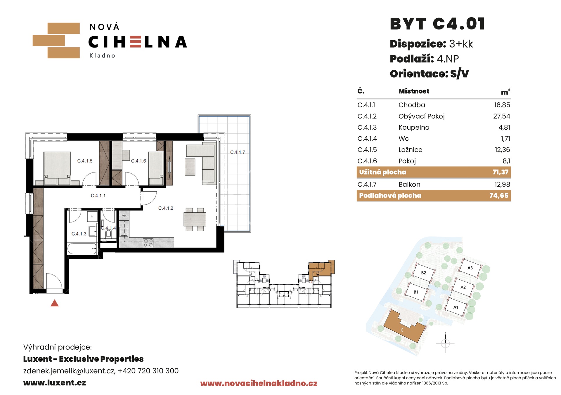 We offer for sale apartment 3+kt with a floor area of 74.65 sqm with a balcony of 12.98 sqm in an extremely economical development project Nová Cihelna Kladno arising in the urban area of Kladno - Rozdělov.
