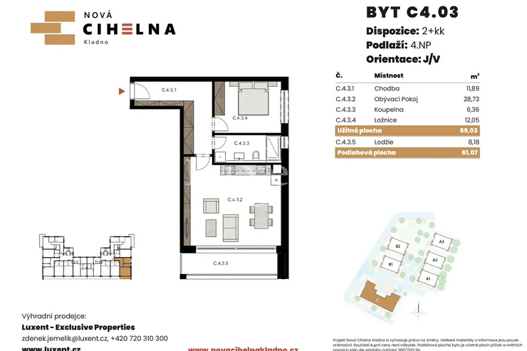 We offer for sale apartment 2+kt with a floor area of 61.07 sqm with a loggia of 8.18 sqm in an extremely economical development project Nová Cihelna Kladno, located in the urban area of Kladno - Rozdělov.