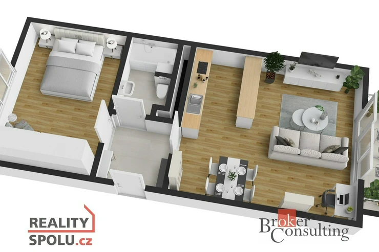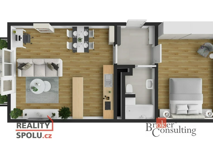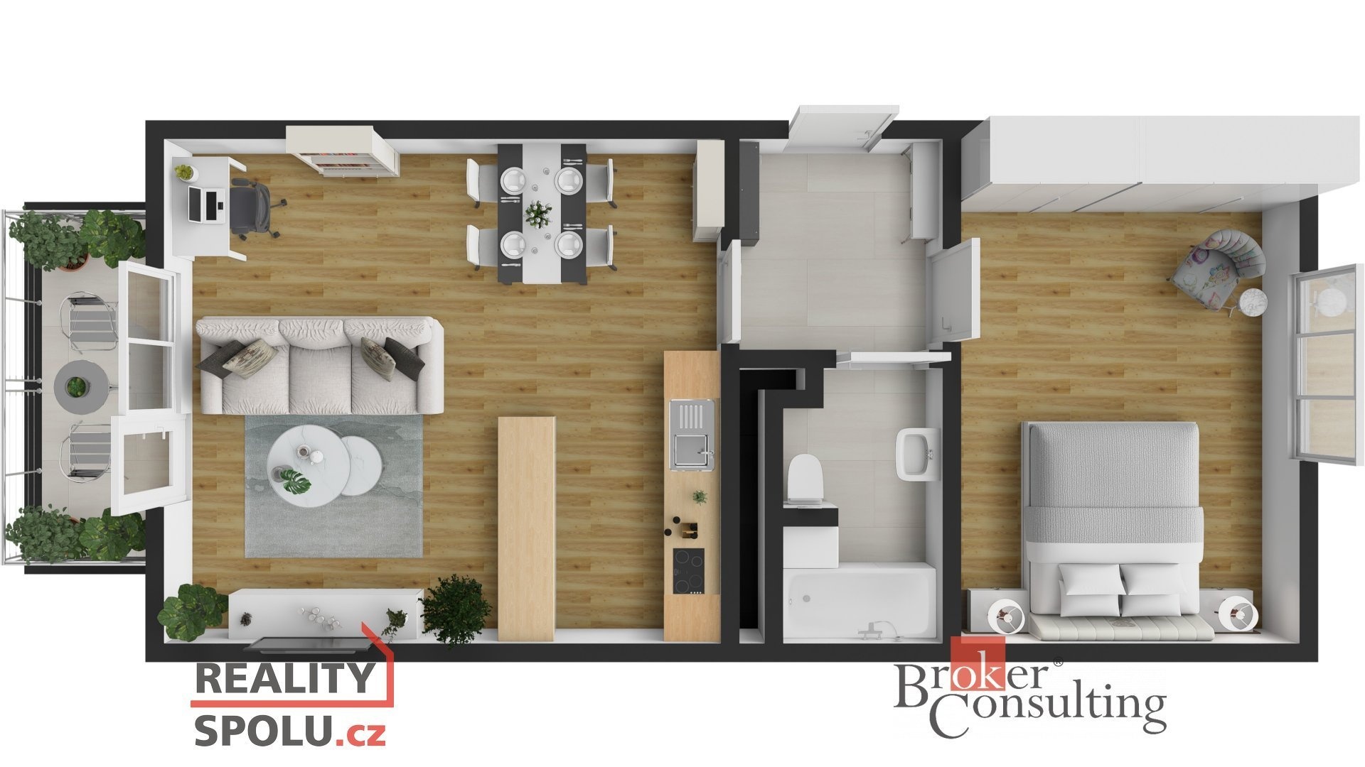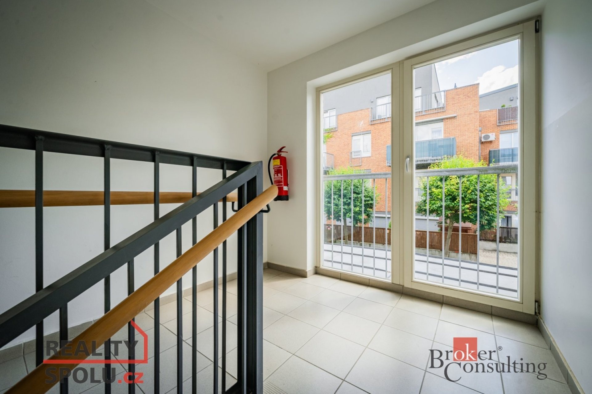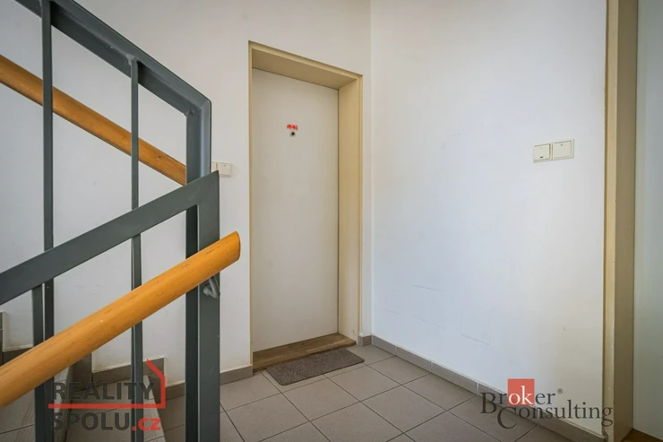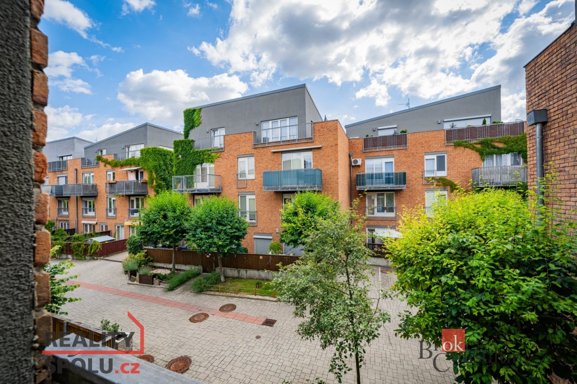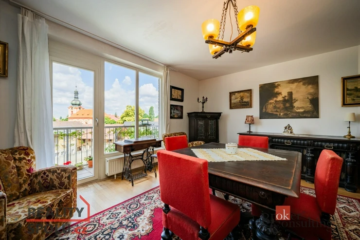 Byt má ideální polohu v prvním patře s orientací východ-západ, pohledu z balkonu vévodí silueta kostela Všech svatých. Obě obytné místnosti mají maximálně využitelný tvar téměř čtverce, v každé je velké třídílné francouzské okno.