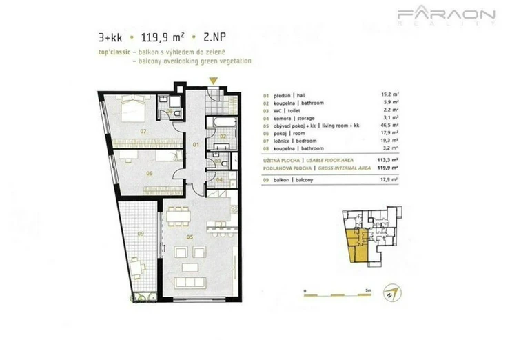 Summary: floor area of the apartment 119.9 m2, terrace 18 m2, cellar 11 m2, two extra large garage spaces.