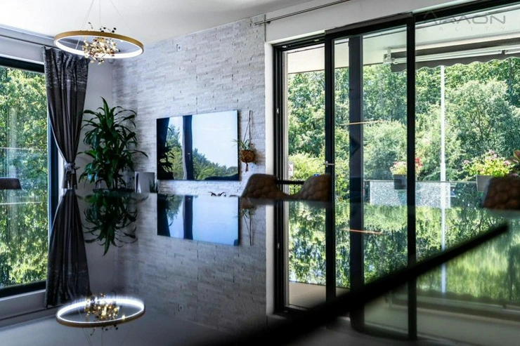 - large-format wooden windows with triple glazing, outdoor electric aluminum blinds