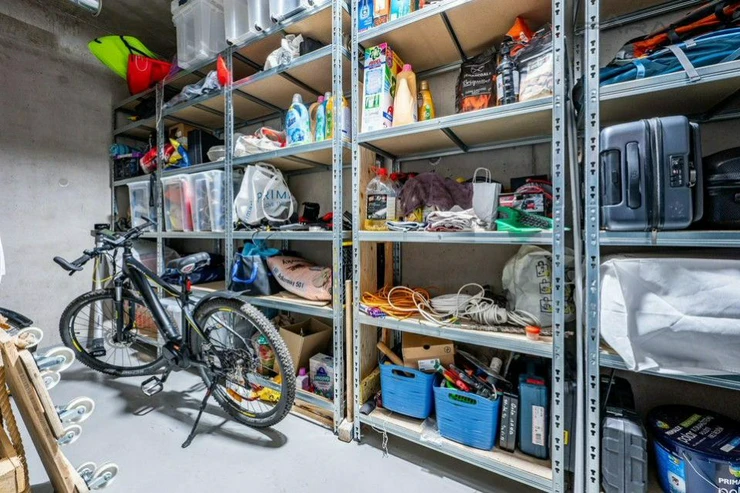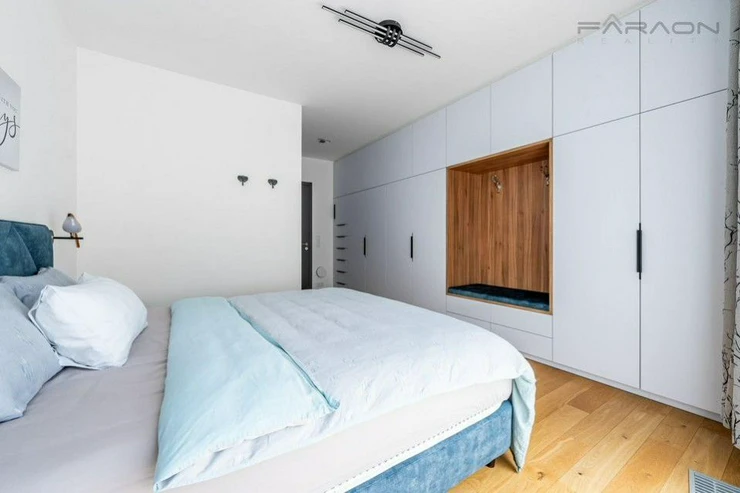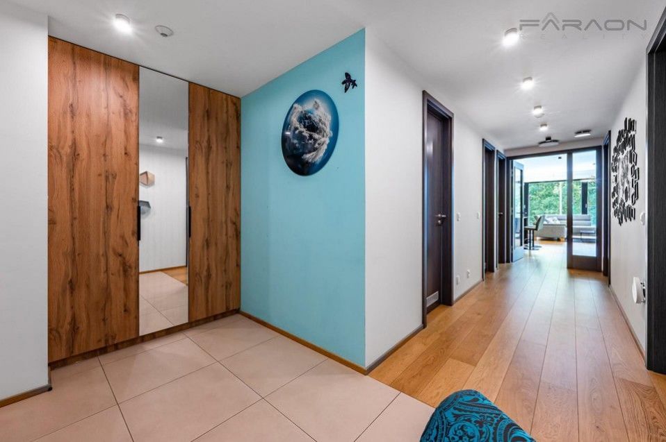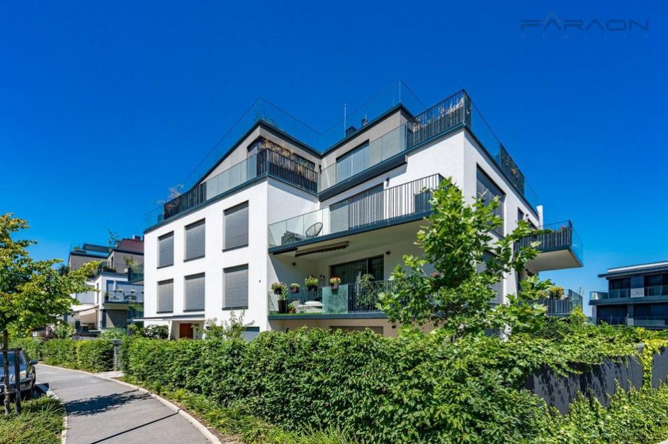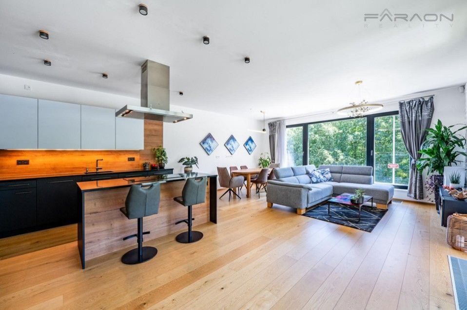 Modern premium 3+kk apartment for sale with a total area of 137.9 m2, with a spacious southwest terrace. The price includes a cellar, two extra large underground garage spaces and full above-standard custom-made equipment worth 3 million CZK.