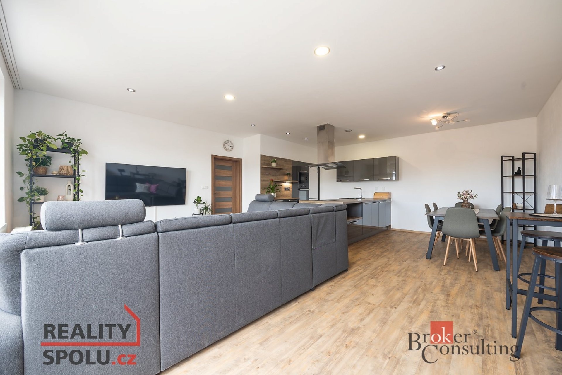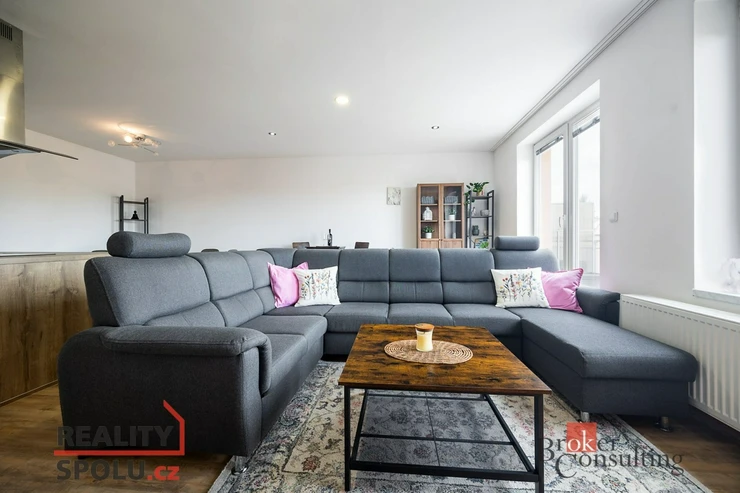 Srdcem bytu je světlý obývací pokoj s kuchyňským koutem a jídelní částí. Kuchyň je vybavena moderními spotřebiči – vestavná lednice s mrazákem, trouba, mikrovlnná trouba, myčka, indukční varná deska a digestoř. Kuchyňský ostrůvek nabízí dostatek pracovní plochy i úložného prostoru z obou stran.