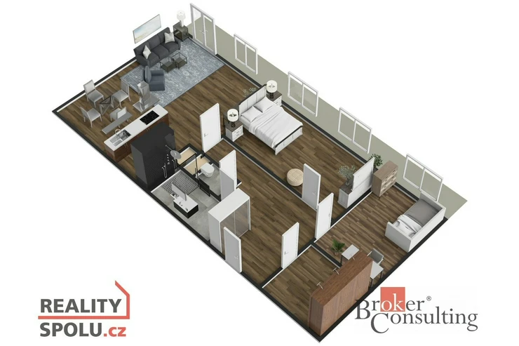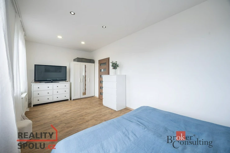 Byt je rozdělen na prostornou předsíň s vestavnou stěnou, ze které se vstupuje do šatny, dětského pokoje, ložnice, koupelny, samostatného WC a obývacího pokoje s kuchyňským koutem.