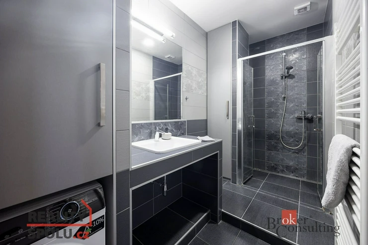 Koupelna je vybavena prostorným sprchovým koutem, žebříkovým radiátorem a dvěma vestavnými skříněmi.