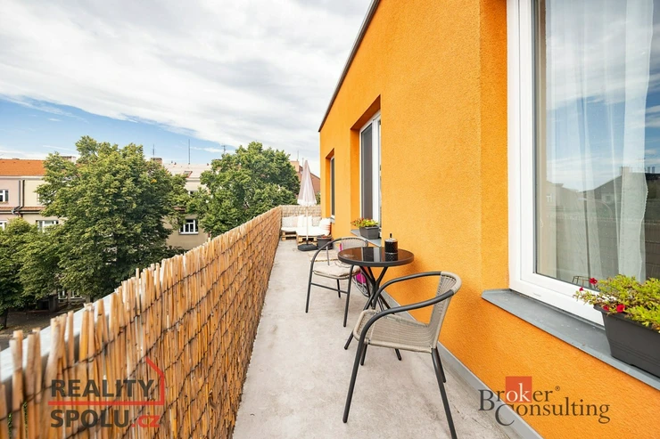 Z obývací části se vstupuje na prostornou terasu (20 m²), která se táhne po celé délce bytu a poskytuje příjemné místo pro posezení i pěstování rostlin.