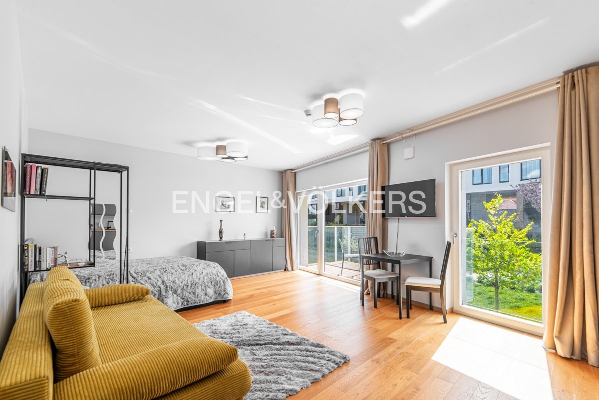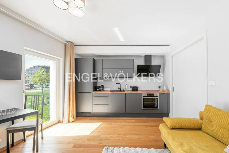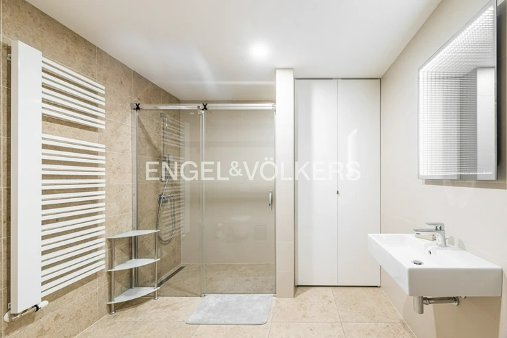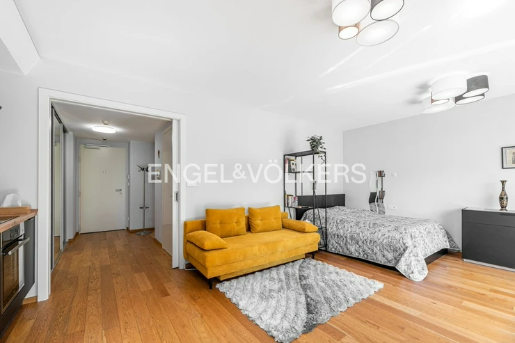 The apartment is oriented to the south-west and offers a view of the greenery and the former monastery of St. Gabriel. The main living room with kitchen and dining area is seamlessly connected to the lounge area, which is visually separated from the sleeping area. The room can possibly be rearranged and the zones completely separated. The apartment includes a hallway with built-in wardrobes, a generous bathroom with a shower and space for a washing machine and dryer.