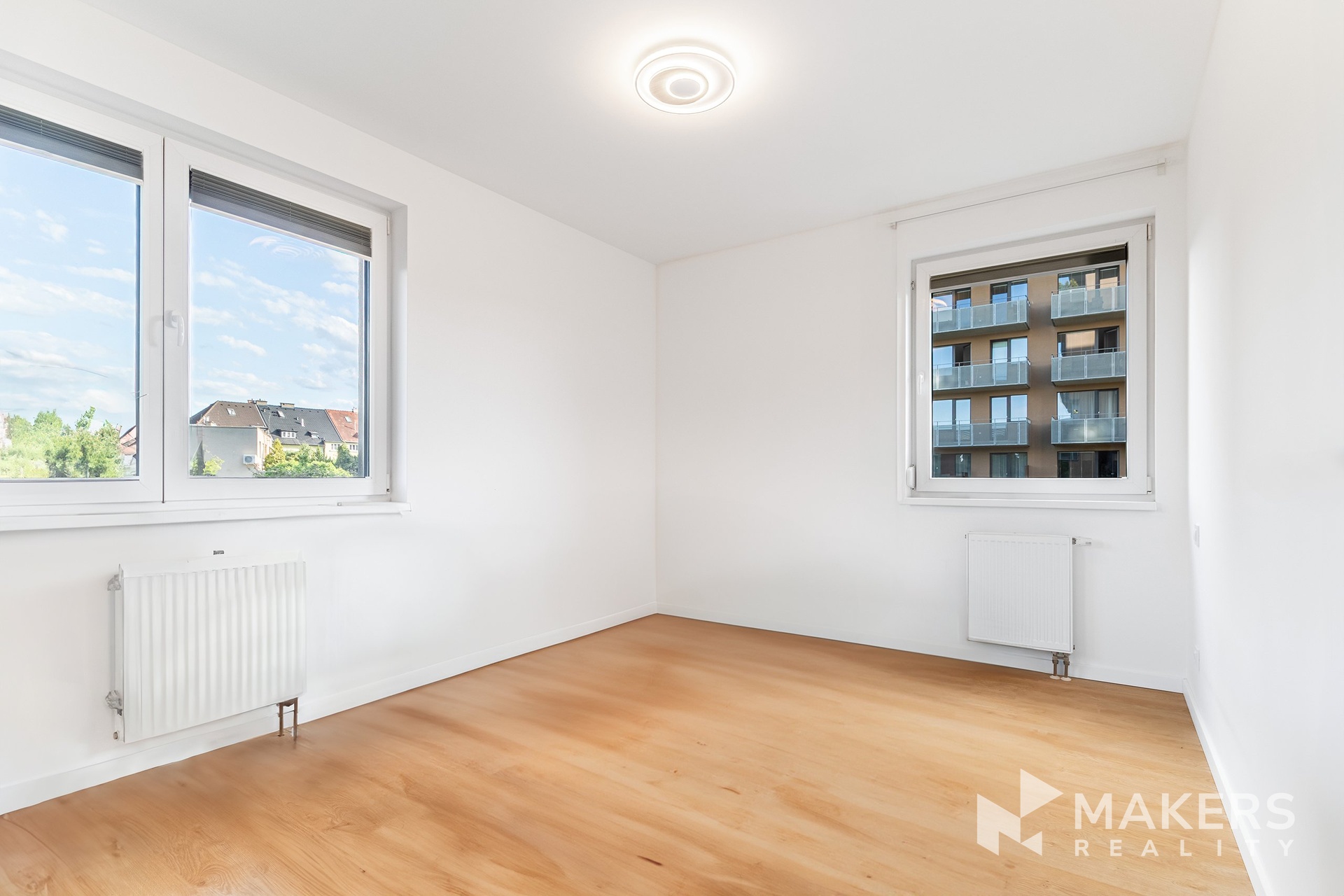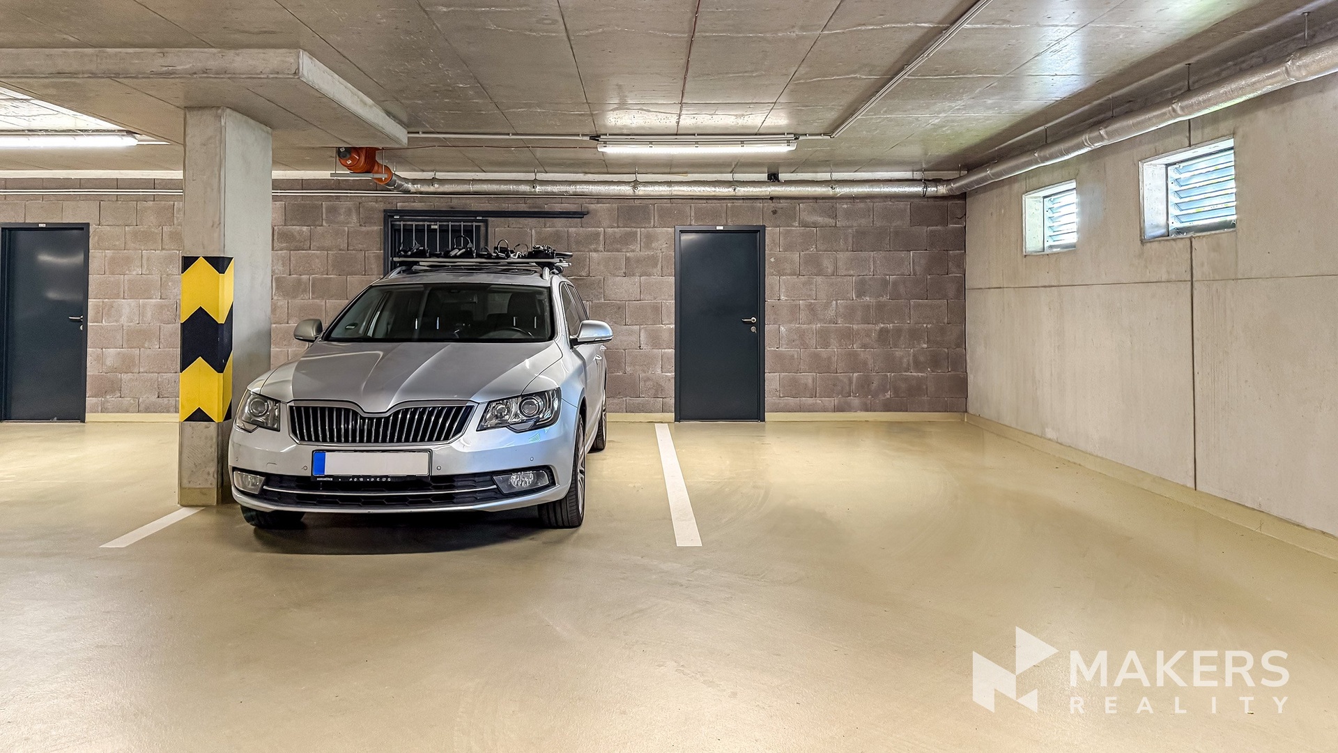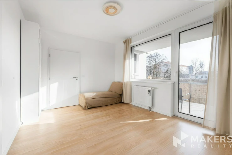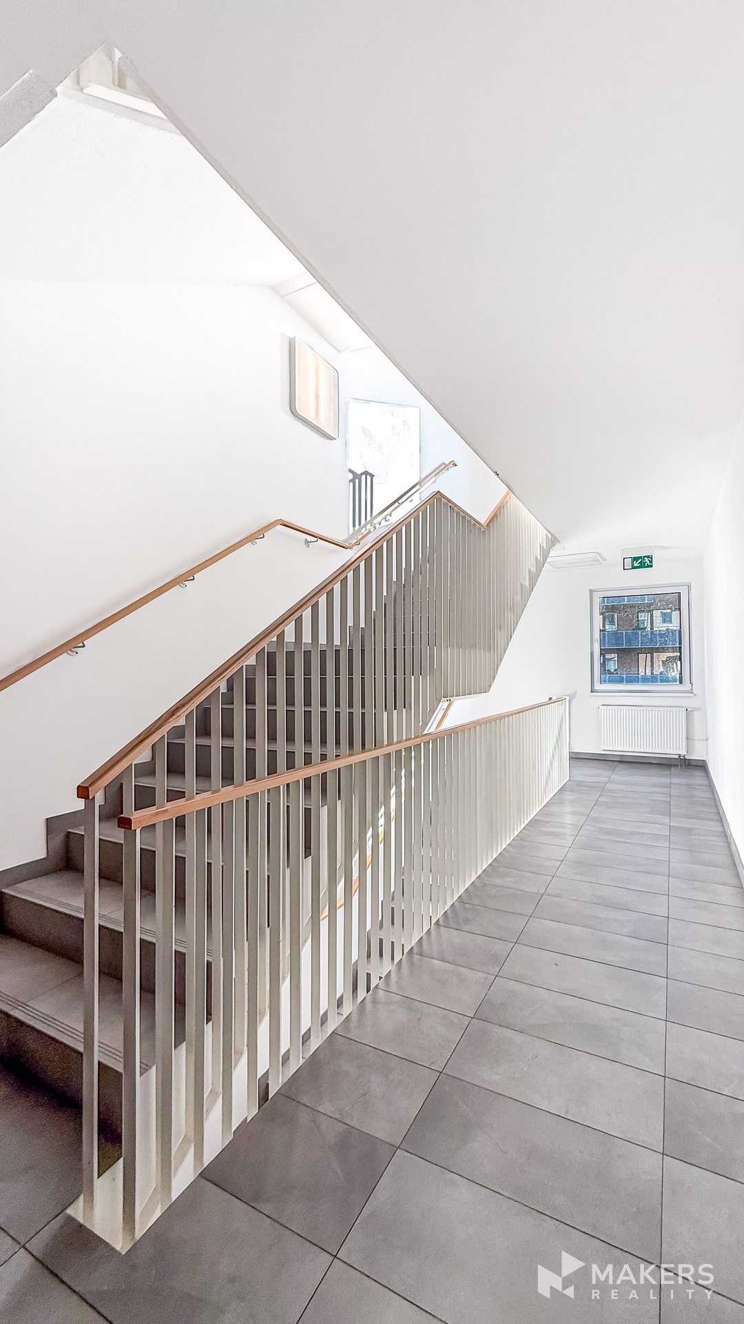 The interior features a spacious living room of 29.5 m² with a stylish modern kitchen. The room has direct access to a large balcony of 10.2 m², south-facing and overlooking the quiet landscaped courtyard of the residence. This balcony is also accessible from the spacious hallway of 11.6 m², which connects all the rooms and can serve as an additional living space or home office thanks to its generous dimensions. There is plenty of room for a bicycle, storage furniture, or reading corner.