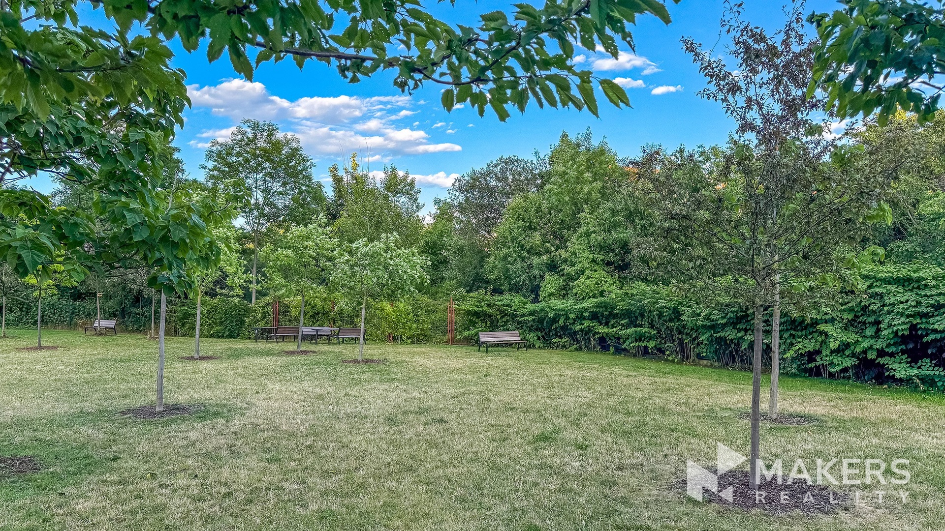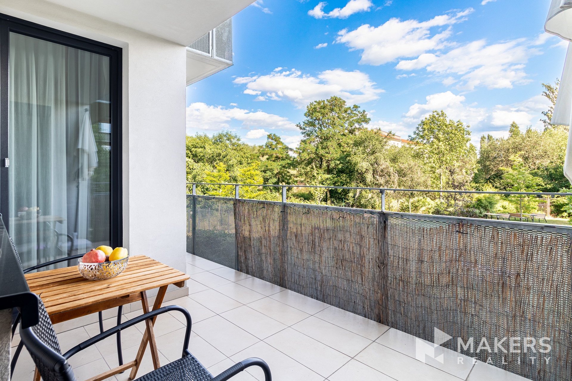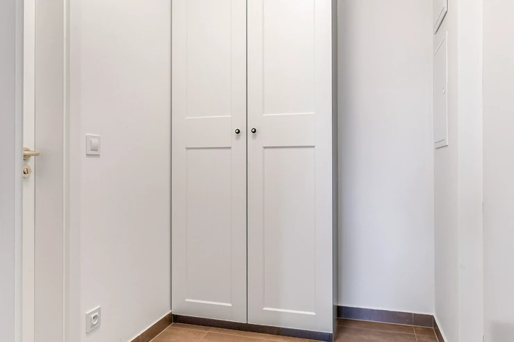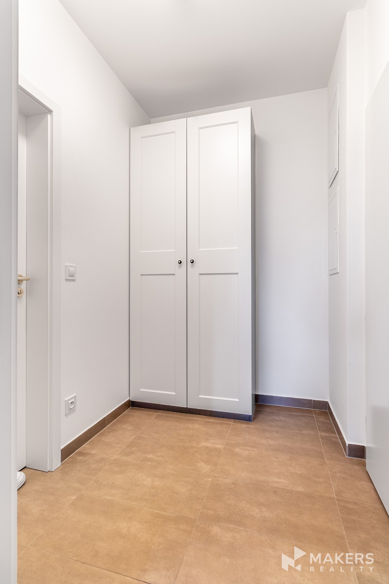 The interior features a spacious living room of 29.5 m² with a stylish modern kitchen. The room has direct access to a large balcony of 10.2 m², south-facing and overlooking the quiet landscaped courtyard of the residence. This balcony is also accessible from the spacious hallway of 11.6 m², which connects all the rooms and can serve as an additional living space or home office thanks to its generous dimensions. There is plenty of room for a bicycle, storage furniture, or reading corner.