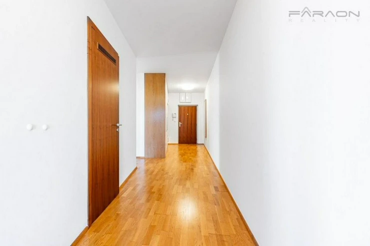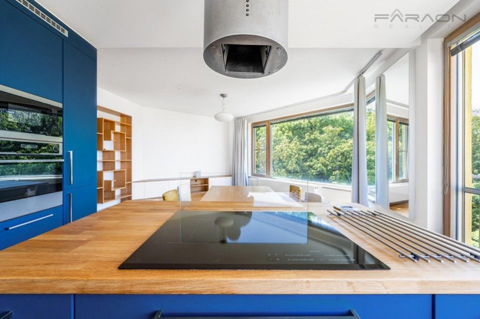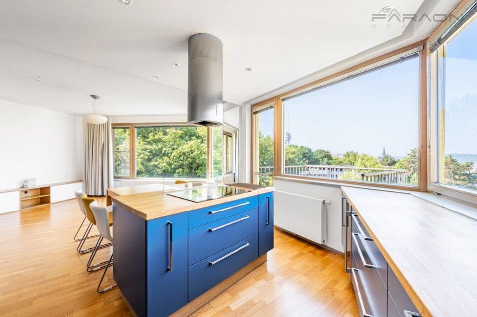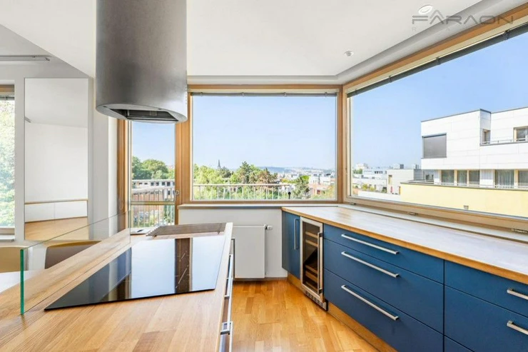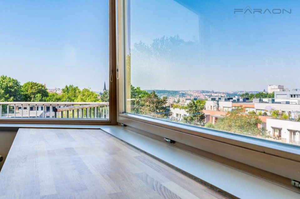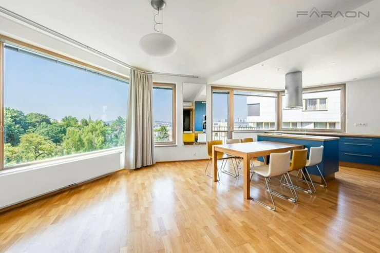 Modern spacious, sunny 3+kk apartment (125.8), with two balconies and unique views of the Prague panorama including Prague Castle and Vítkov and at the same time the greenery of the adjacent Parukářka park located on the 5th floor of a residential project from 2010, in a quiet part of Prague's Žižkov with a cellar and a parking space located in the basement of the house.