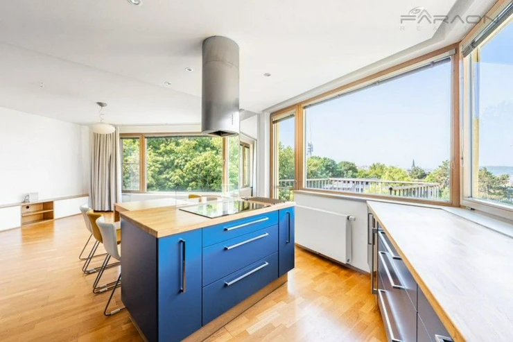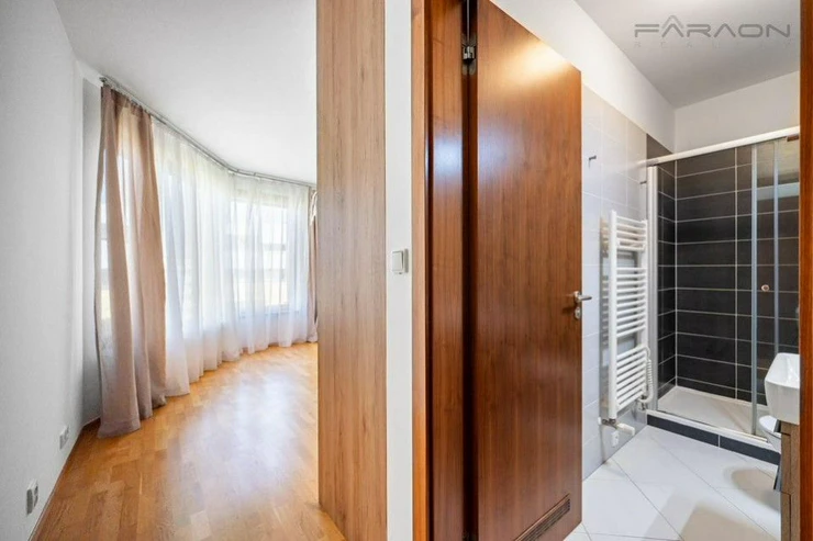 The equipment includes a modern kitchen equipped with built-in appliances (dishwasher, induction hob, hanging extractor hood, electric and microwave oven Electrolux, wine cooler, fridge with freezer. Large-format tiles and underfloor heating in the bathrooms, wooden Euro windows with insulatingglass, security entrance doors, LED lights in all areas, washing machine, dryer. Heating is provided by a central boiler room in the house. The purchase price includes 1 parking space and a cellar on the -1st floor of the house with an elevator.