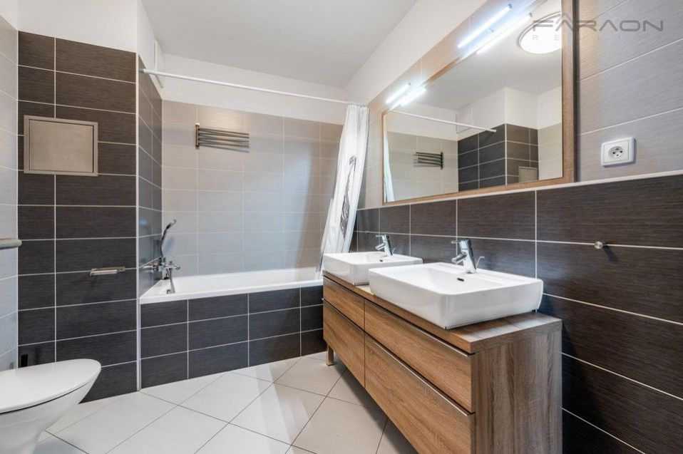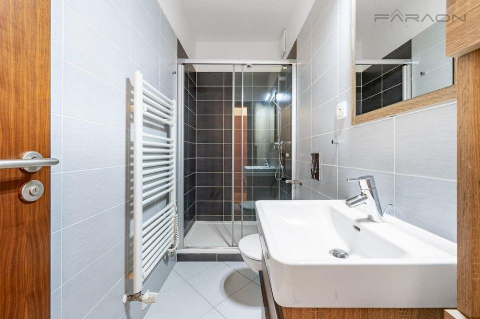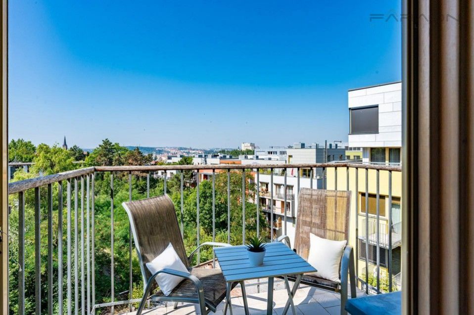 The layout of the 3kk apartment consists of a living room with a fully equipped kitchen and access to a balcony with seating and panoramic views of Prague Castle and Vítkov. Two bedrooms - of which the master bedroom with an en-suite bathroom with shower, another large bathroom with a bathtub, toilet and bidet, an extra separate toilet, an entrance hall with built-in wardrobes.