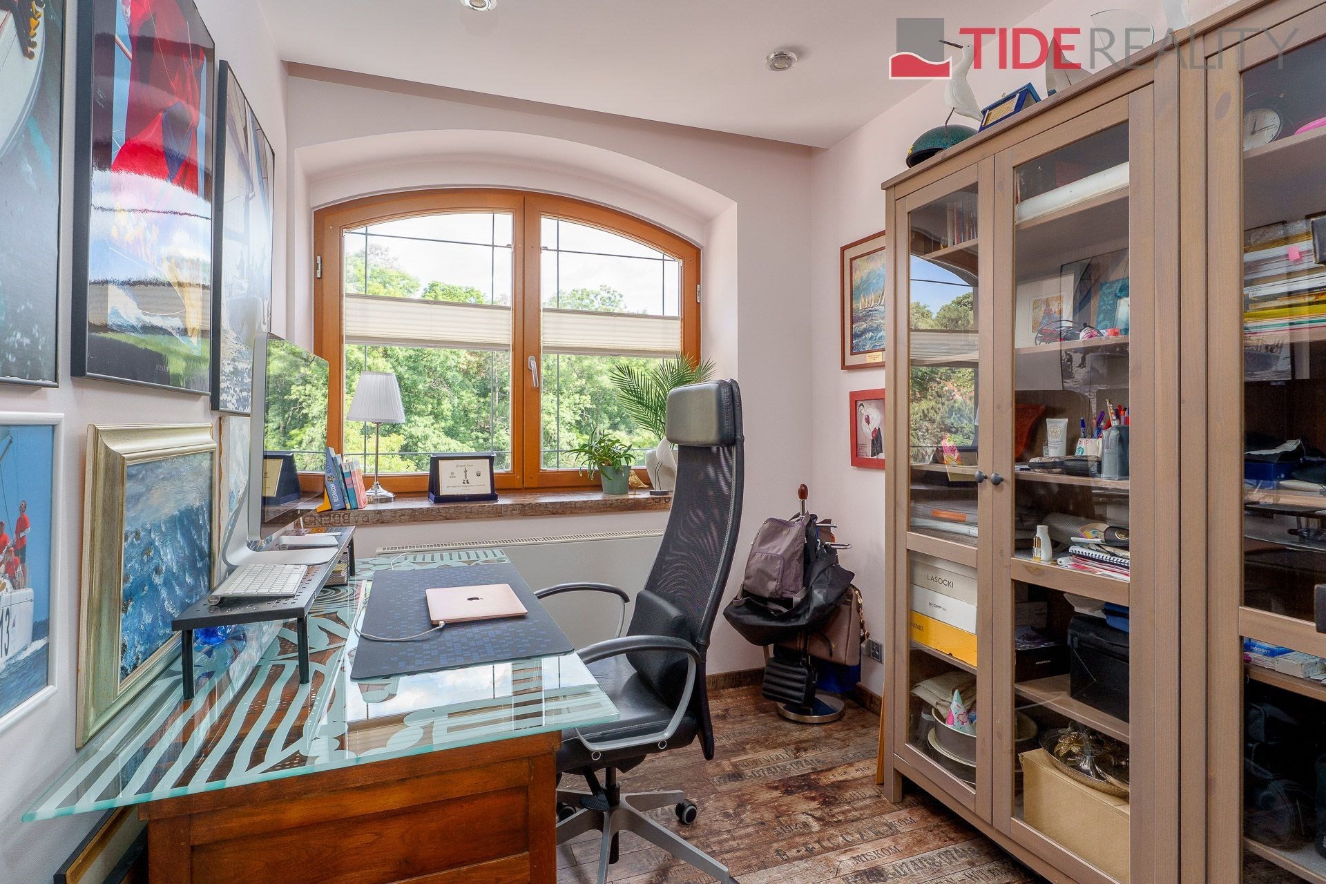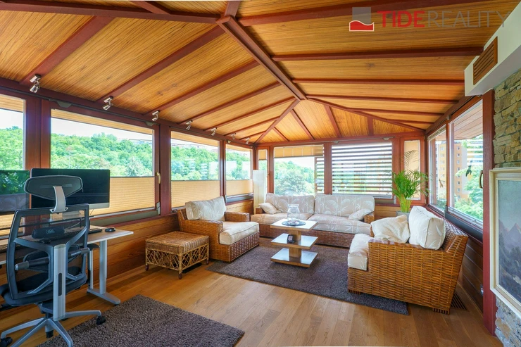 Zimní zahrada zahrada přístupná po schodech z obytného prostoru je klimatizovaná a dnes slouží jako pracovna i příjemný prostor pro posezení. Vlastně druhý obývací pokoj nad střechami okolních domů... Na ni navazuje venkovní terasa.