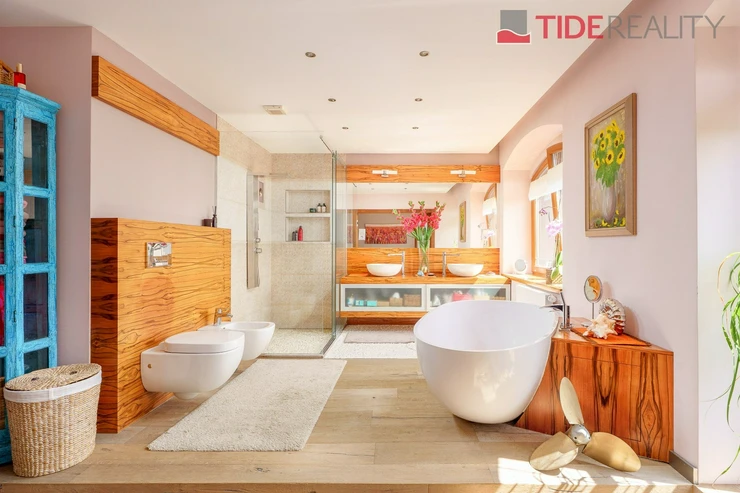 Manželská ložnice (17,6 m2) je přímo propojena s koupelnou o ploše 14 m2, která vytváří privátní wellness zázemí.