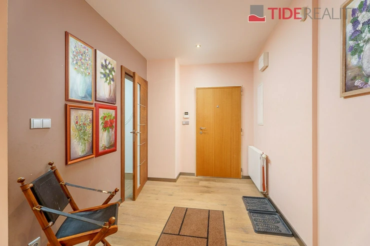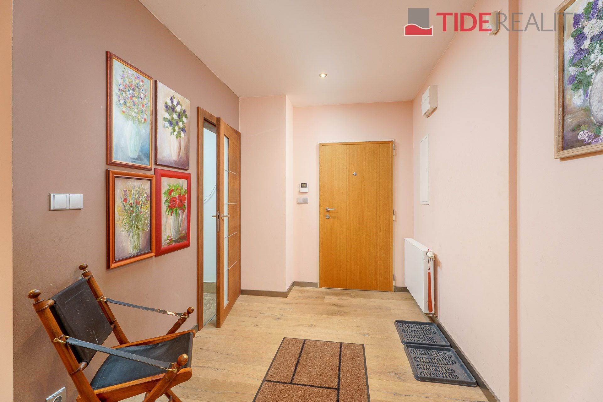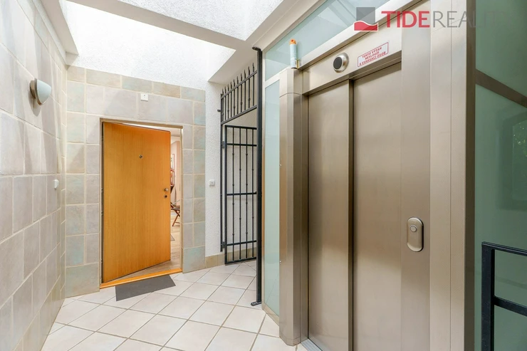 Byt má dostatek úložných prostor dvě komory přímo v bytě a dvě sklepní místnosti v suterénu domu, kde je i garáž pro majitele bytových jednotek. Spolu s bytem je prodáváno jedno garážové stání. Dům má výtah propojující všechny podlaží.
