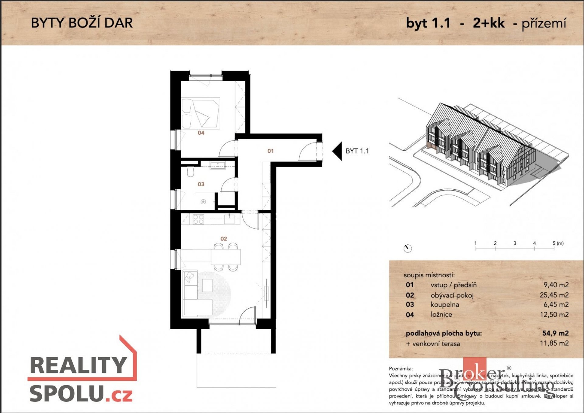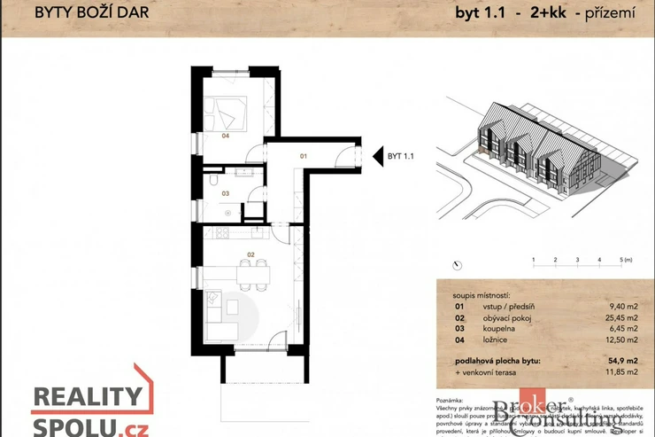 Nabízený byt: 1.1. dispozičně řešen 2+kk s celkovou plochou 71m2, která se skládá z terasy 11,85m2 a sklepní koje 4,4m2. Další byty v nabídce na webu realitybozidar