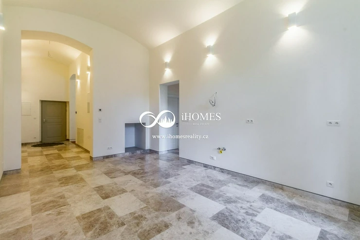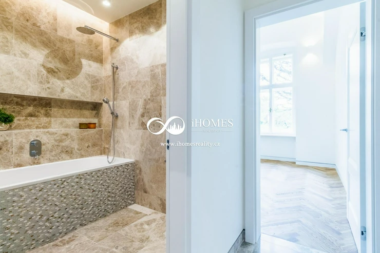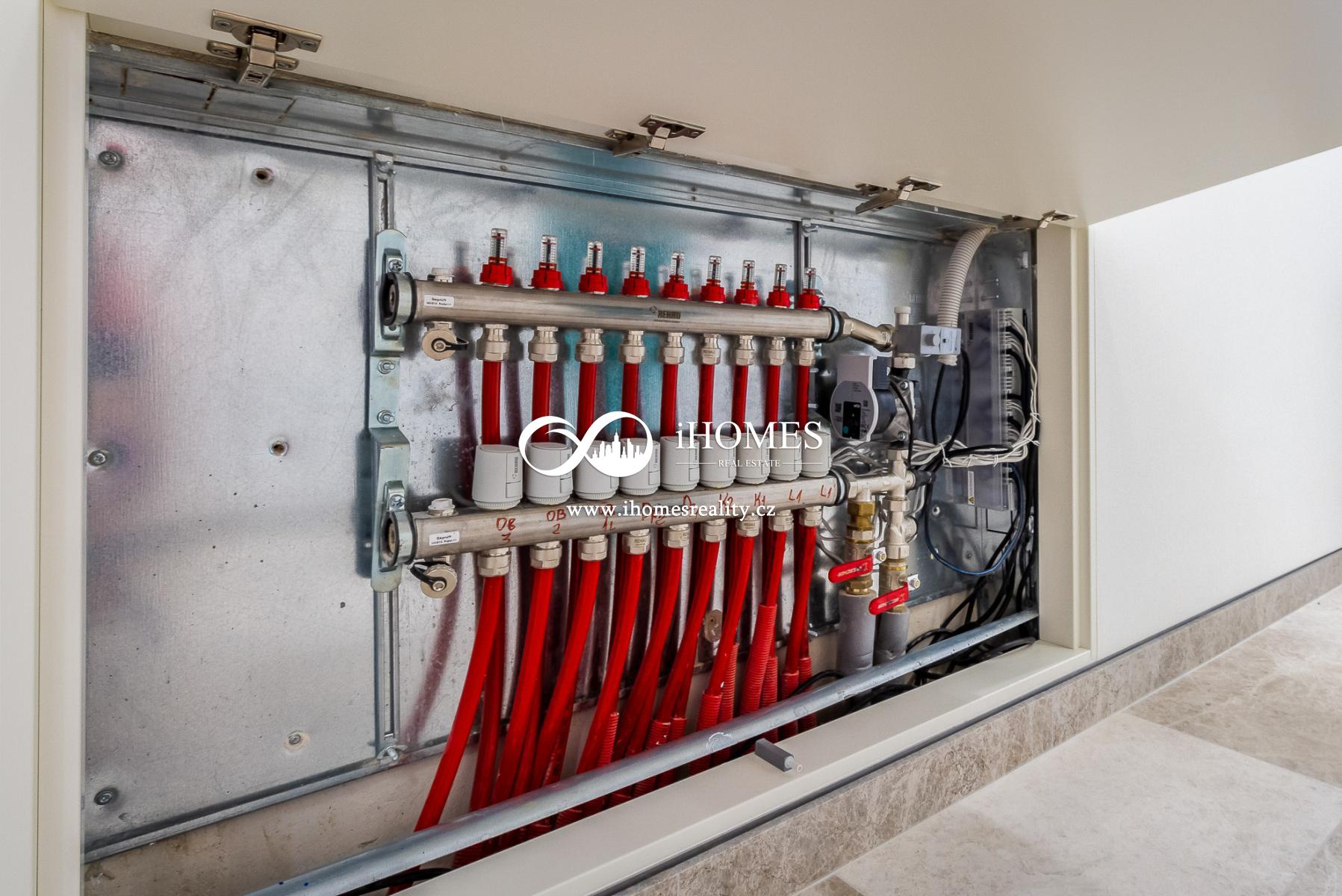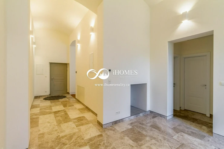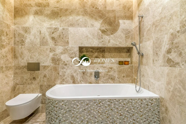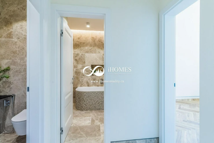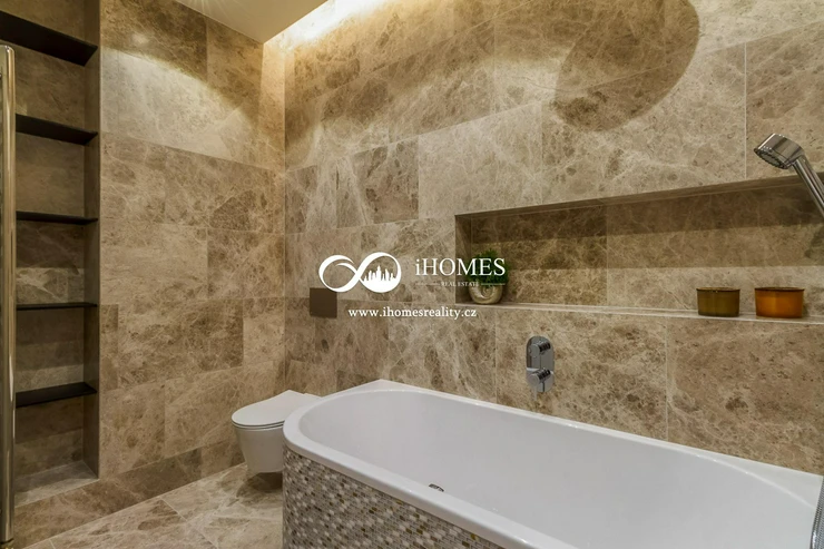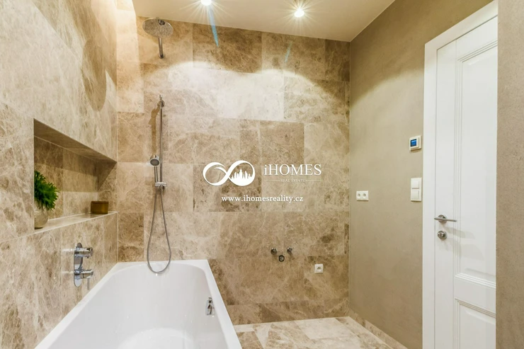 Floors: silver-veined marble (INTERIER STONE) and oak parquet (BOHEMIA Exclusive). Heating: water-based and electric underfloor heating throughout the apartment (REHAU + DELTA) Plaster: walls and ceilings finished with lime-cement plaster (Sakret) and skim coat (Stemex) Doors: security, fire-resistant, soundproof panel doors, class 3+ (Adlo), interior doors (Profidoors) Casement windows (Okna Langer), lighting (Rendl Light Studio), 200-liter horizontal water heater (Dražice)