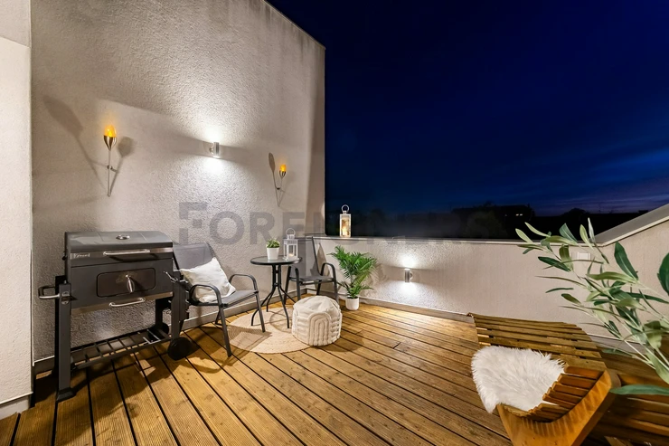 This house offers a total of three terraces, a storage room, and two covered parking spaces in front of the house. The entire project is fenced and includes a shared garden. Maintenance costs are divided among all members of the homeowners’ association (SVJ).