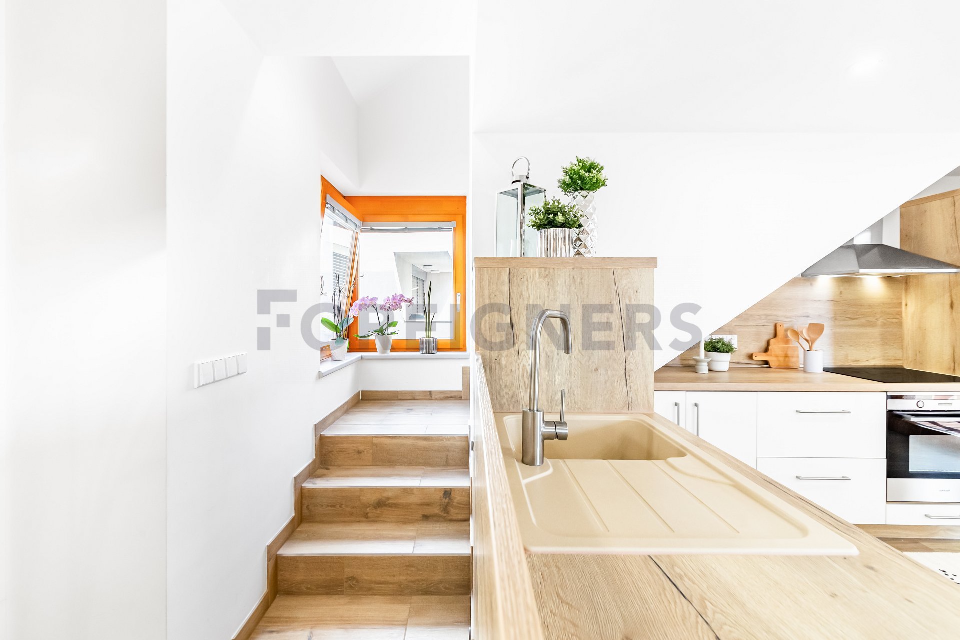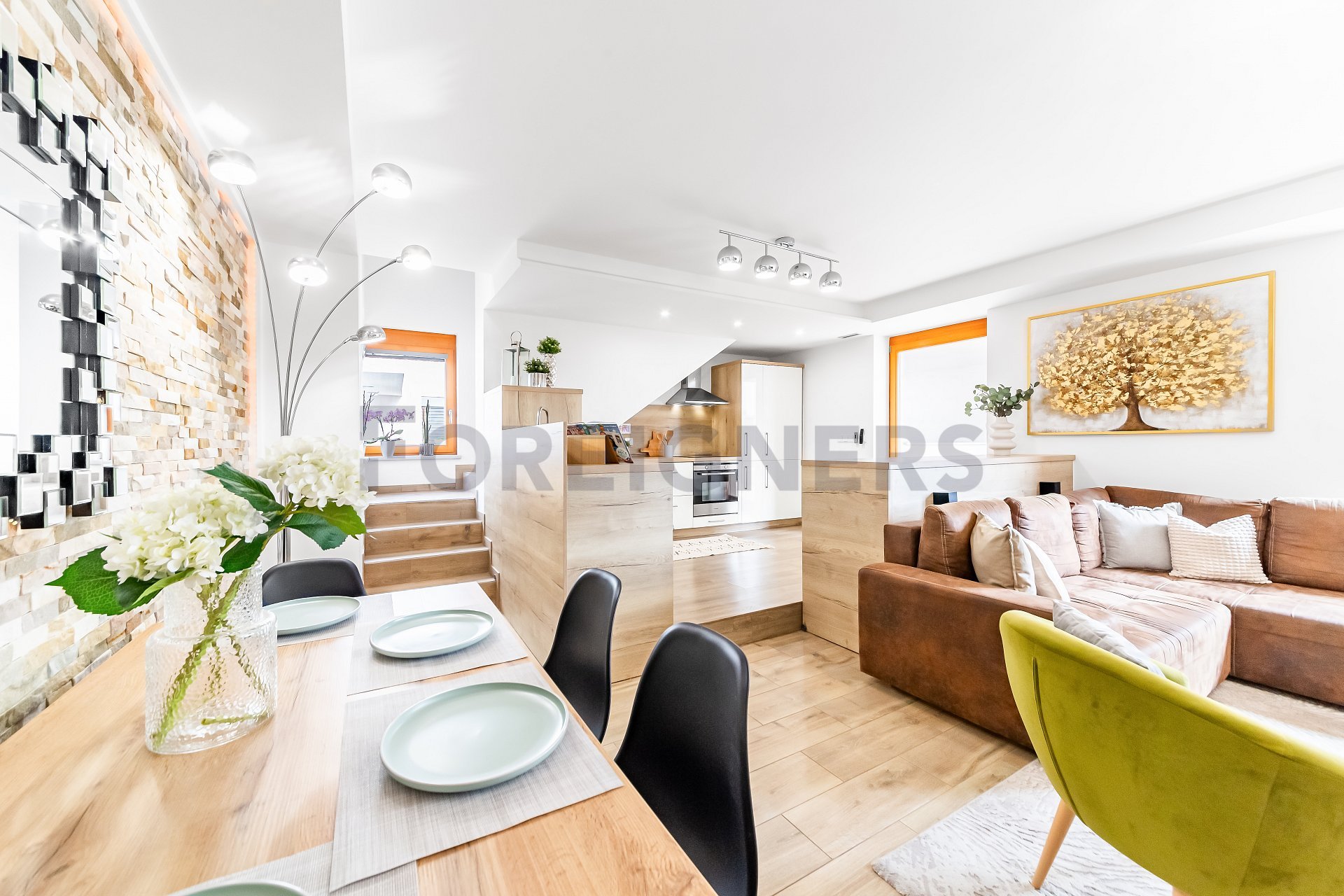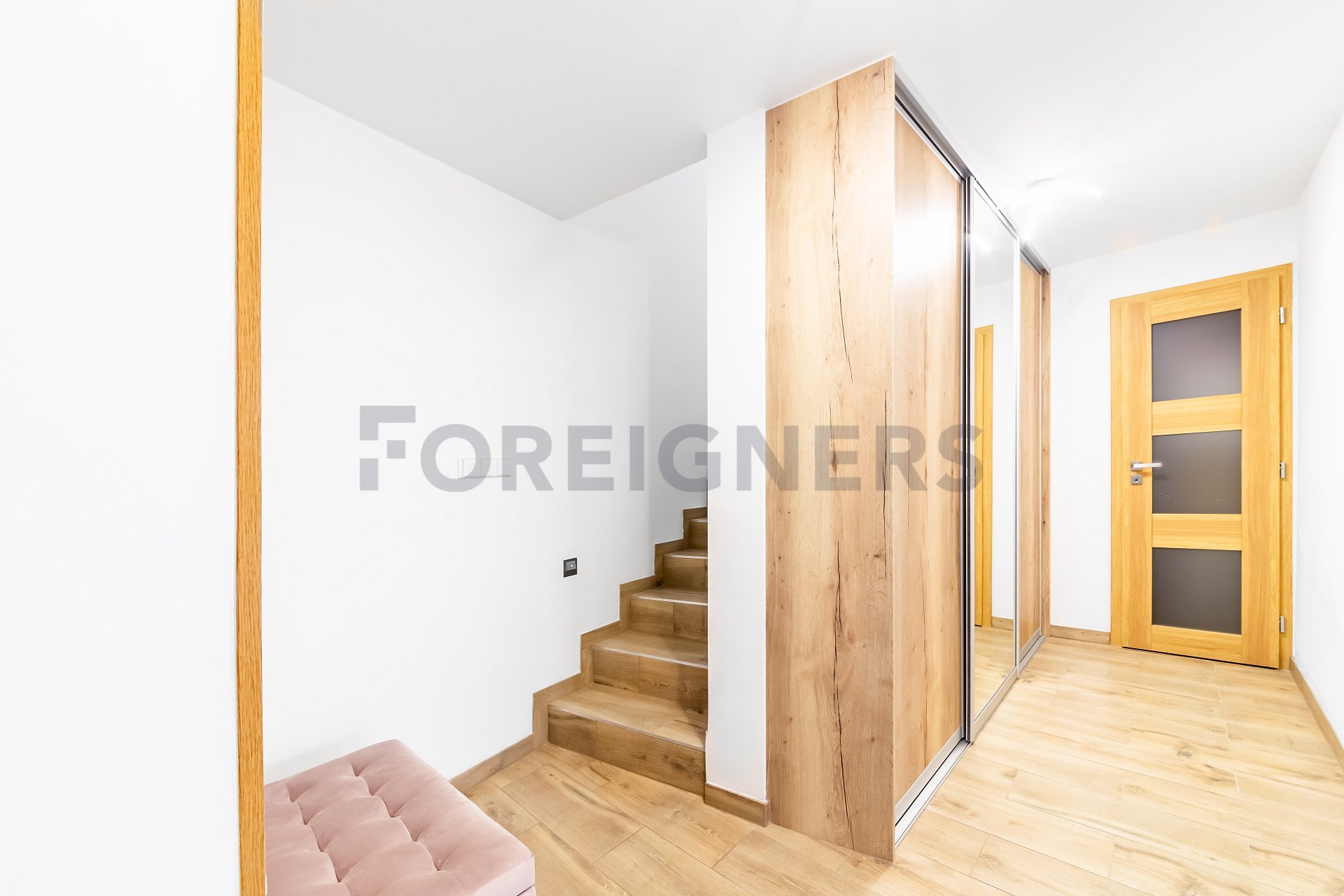The apartment has the character of a terraced house. However, the property has been officially approved as two residential units. Upon entering the house, you are welcomed by a spacious hallway with a built-in wardrobe, providing ample storage space. The ground floor offers a cozy study with a bright French window and access to one of the terraces. There is also a bathroom and a utility room.