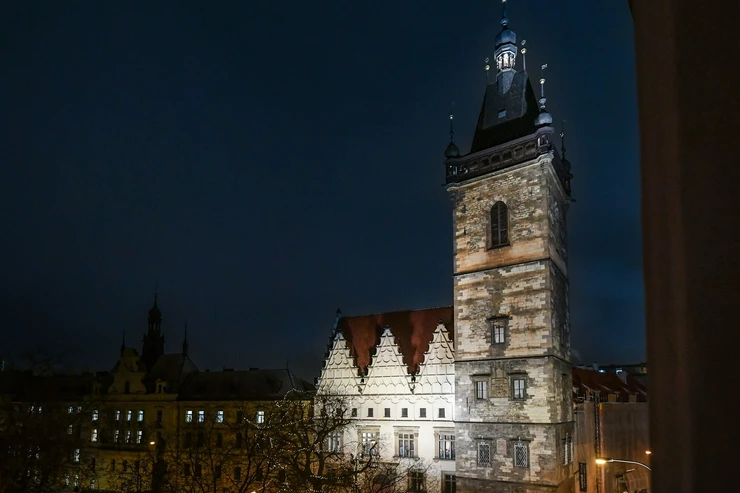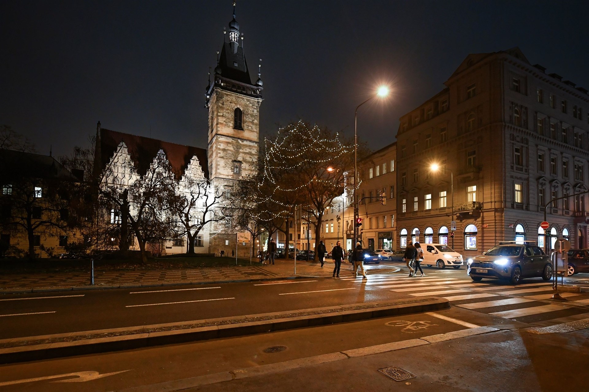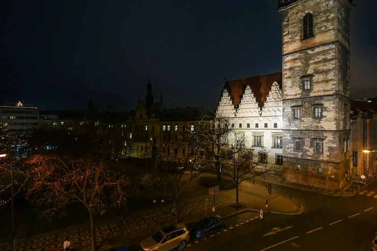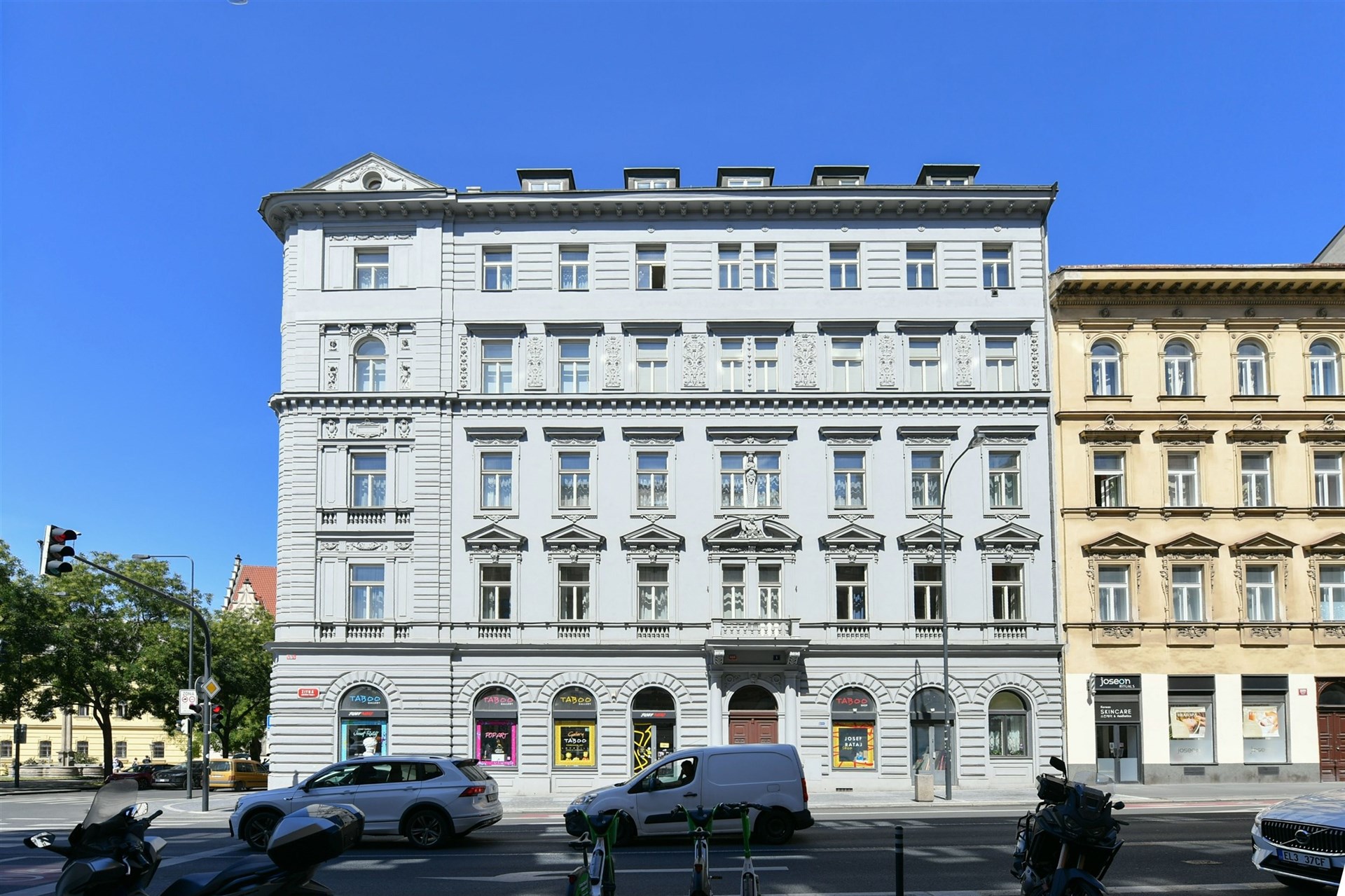 The building sits in a prime central location with excellent transport links and amenities: Wenceslas Square is a 10-minute walk, tram stops Karlovo náměstí and Lazarská are just around the corner, and the B-line metro is moments away.