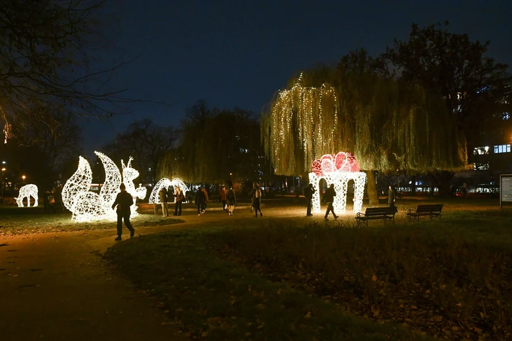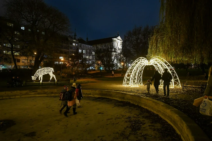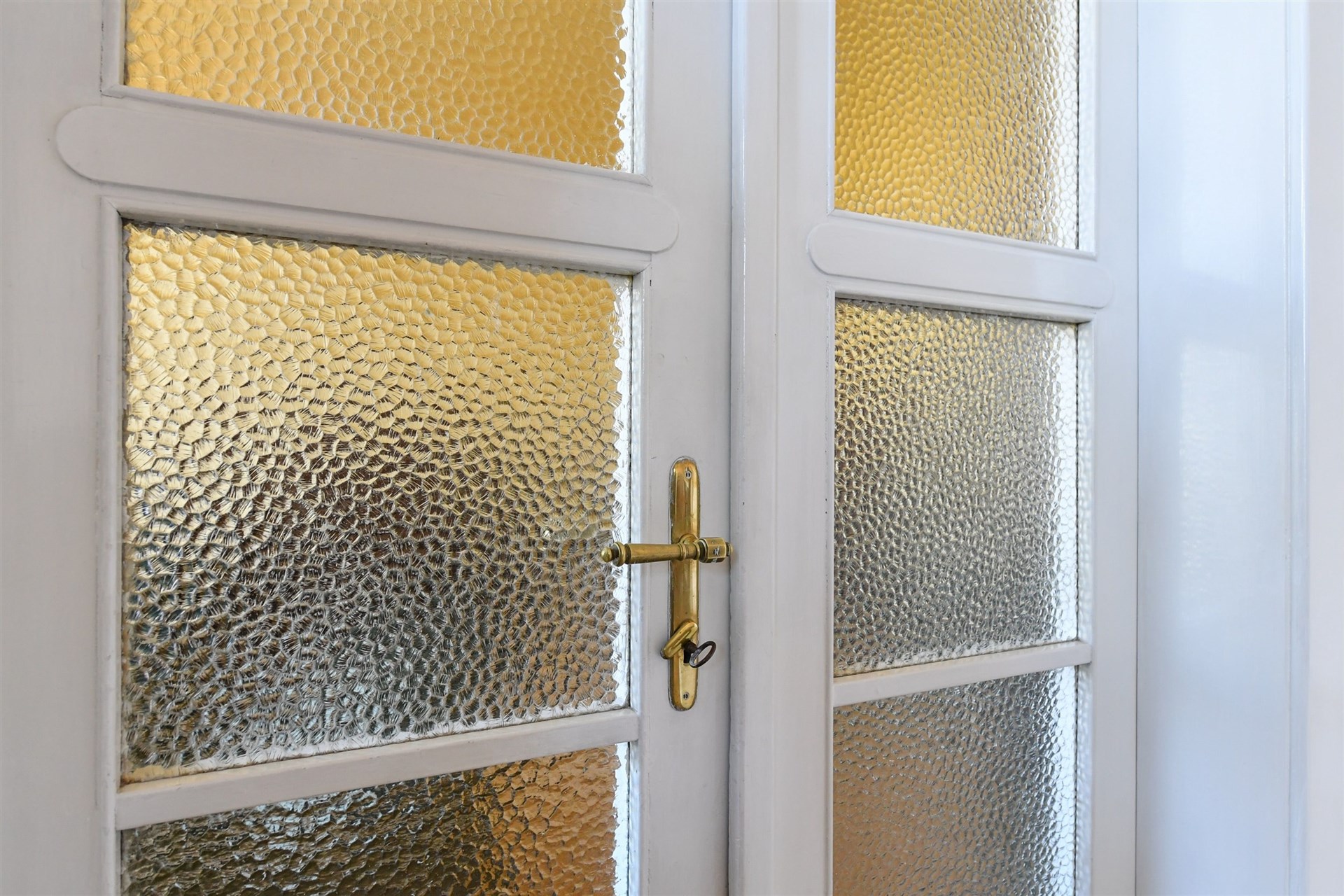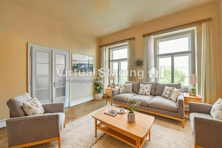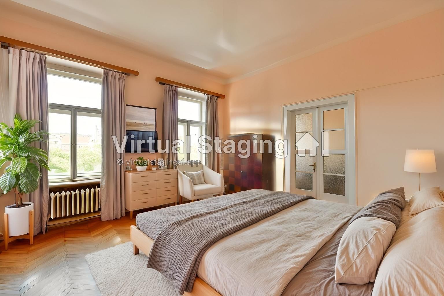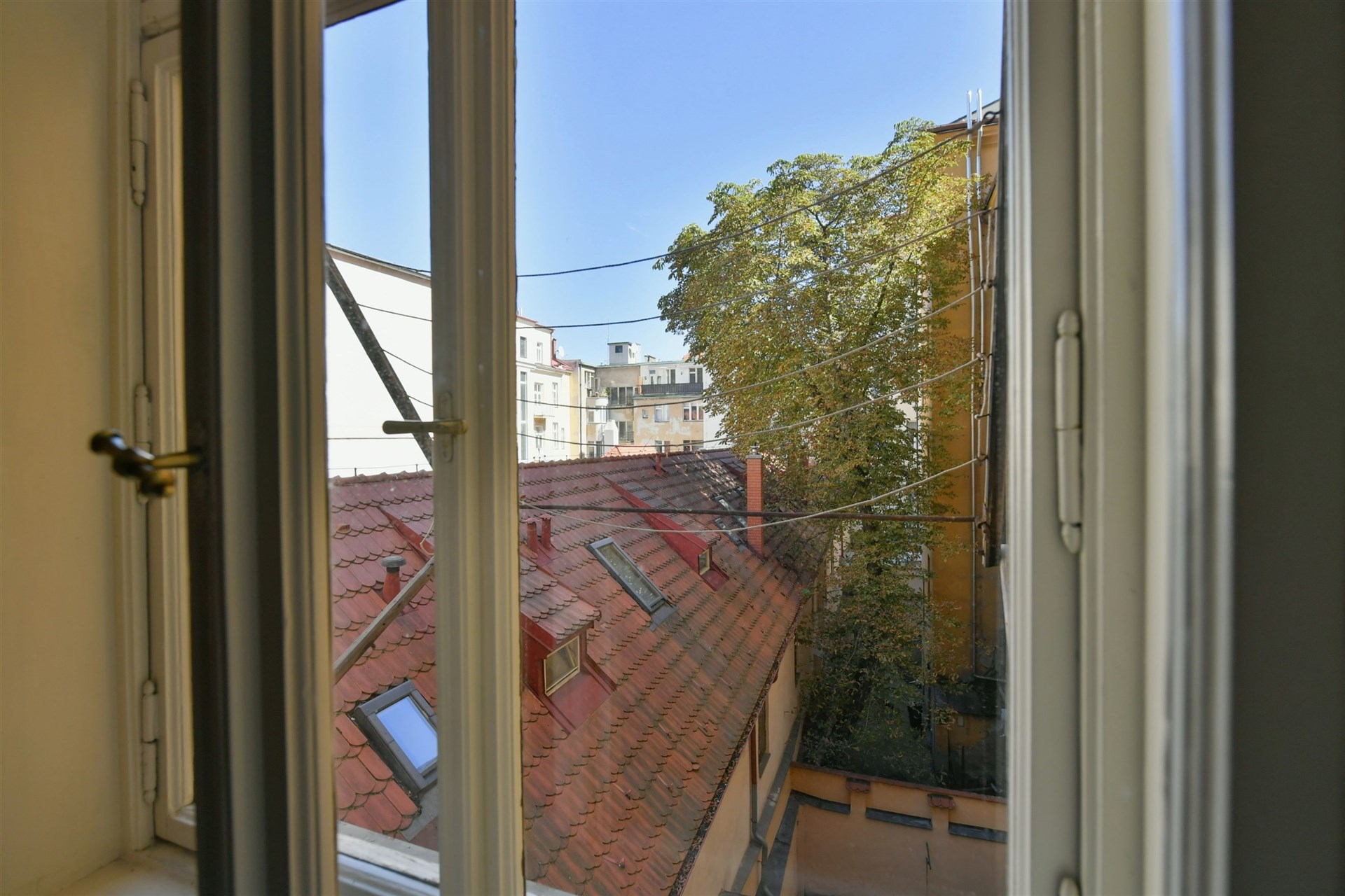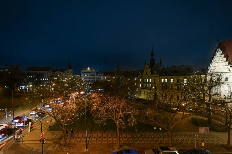 The living areas feature beautiful views over the greenery of Karlovo náměstí and the New Town Hall, while the kitchen overlooks a peaceful inner courtyard. Period details include 3.7-metre ceilings, preserved parquetry floors, original double doors and door handles, and recently installed double-glazed casement windows.