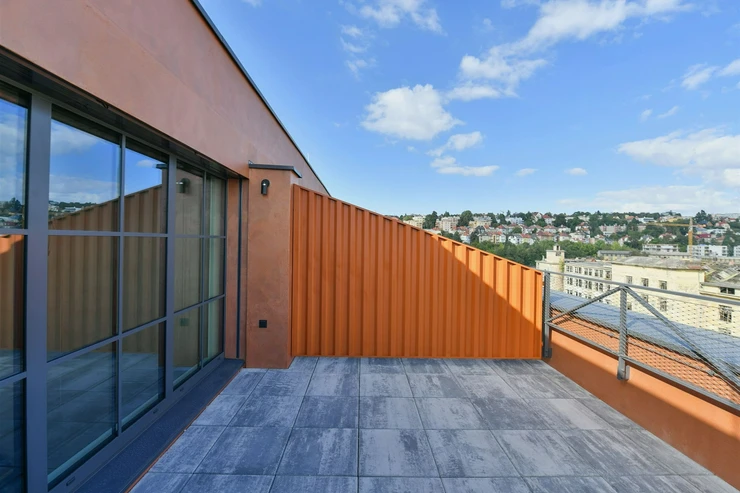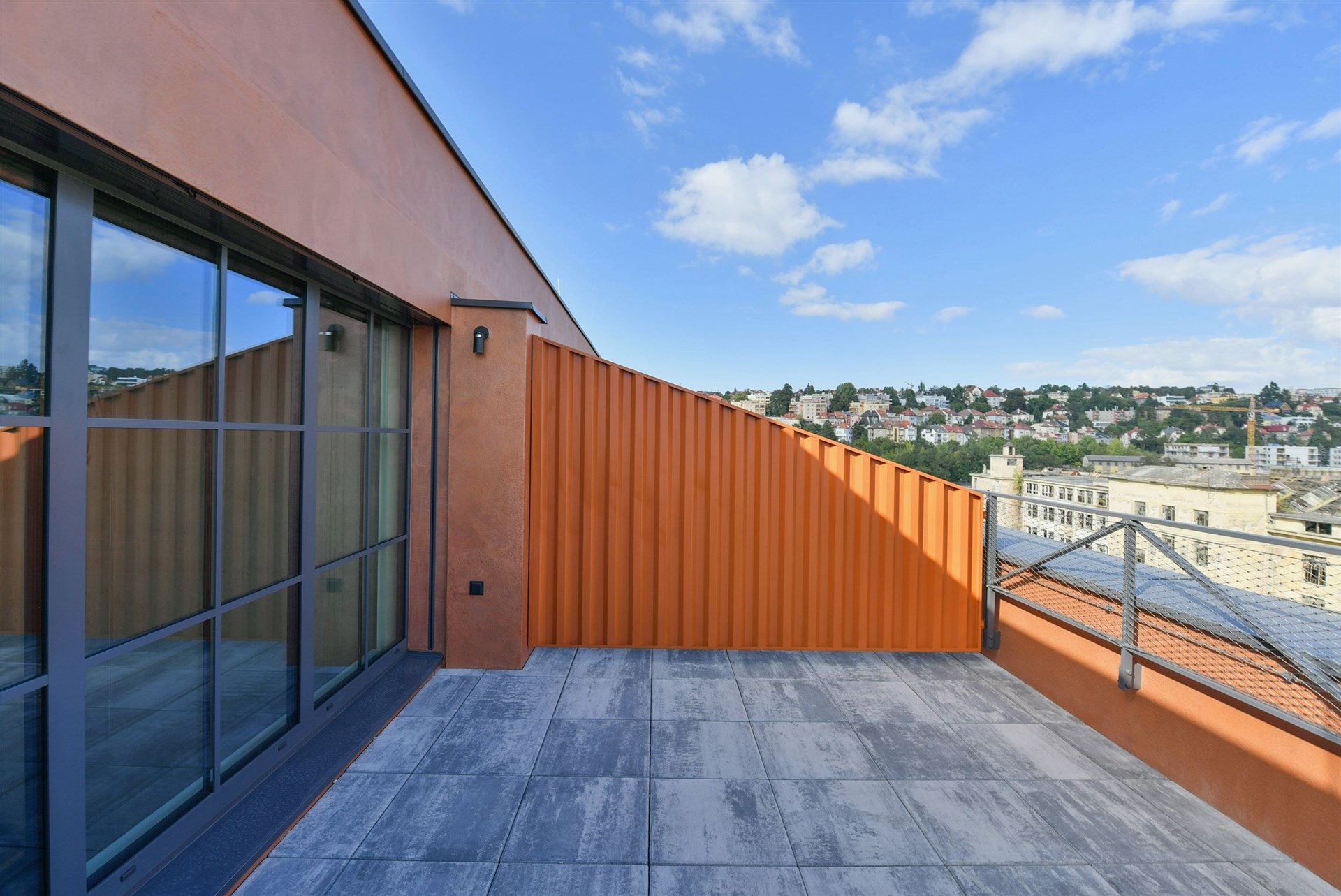 Velmi tichý byt 2+kk s terasou, balkonem, klimatizací, úžasnými výhledy a garážovým stáním. Jen 2 minuty na metro, 16 minut do centra.