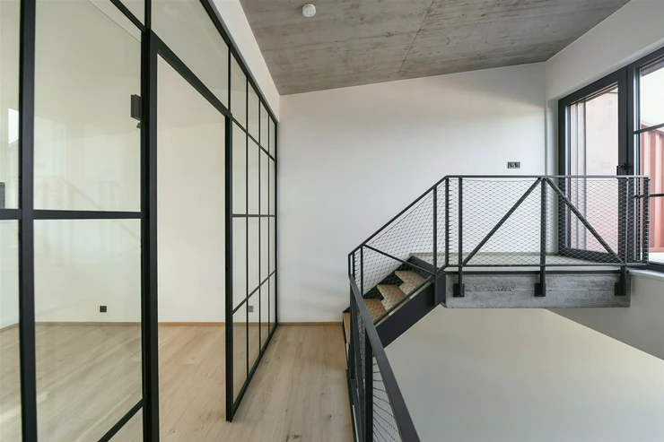 ● protihluková velkoformátová okna nápaditě odkazující na industriální historii lokality