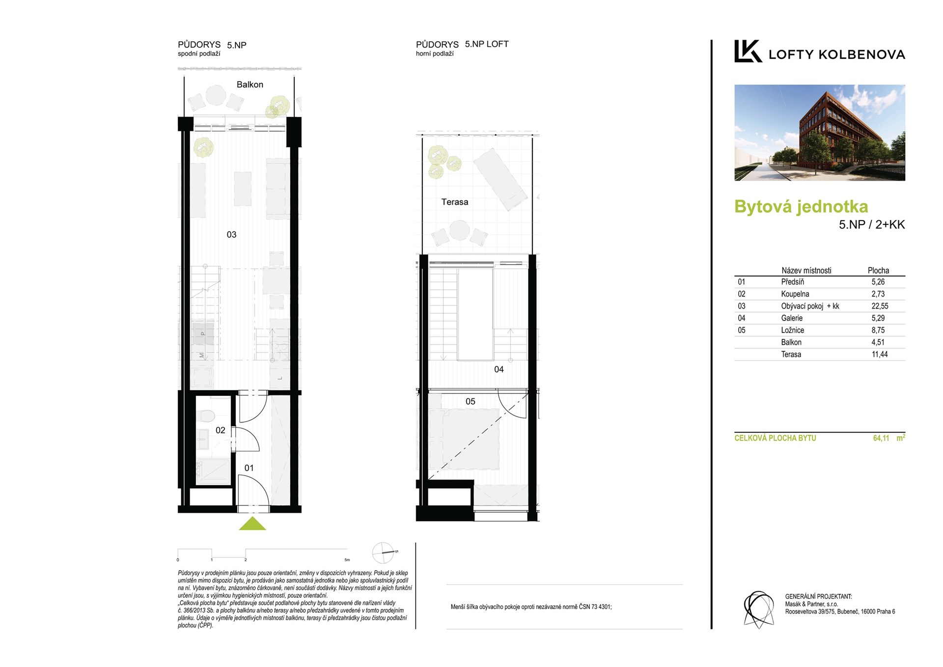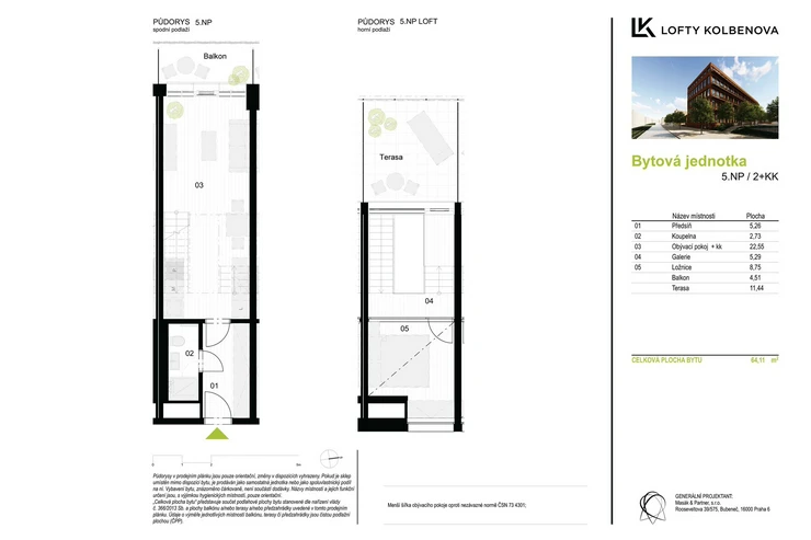 Plochy k bytu: celková plocha bytu 64,11 m2, předsíň 5,26 m2, koupelna 2,73 m2, obývací pokoj + kk celkem 22,55 m2, galerie 5,29 m2, ložnice 8,75 m2, balkon 4,51 m2 a terasa 11,44 m2.