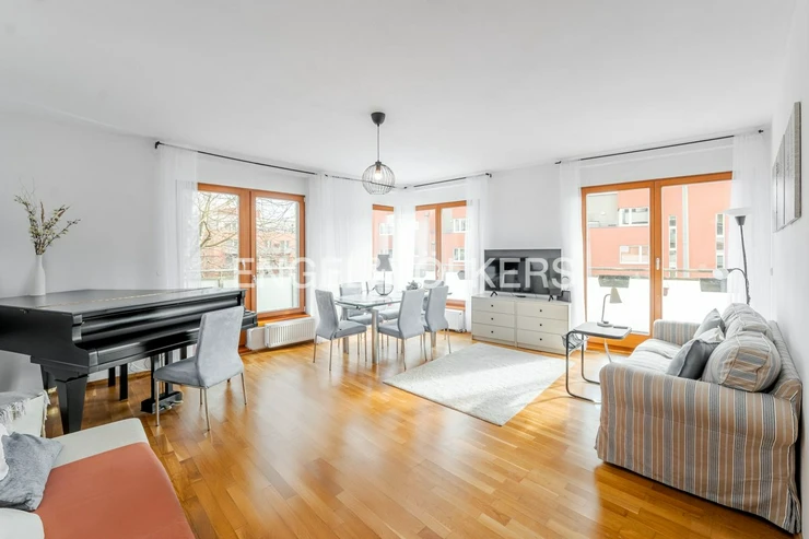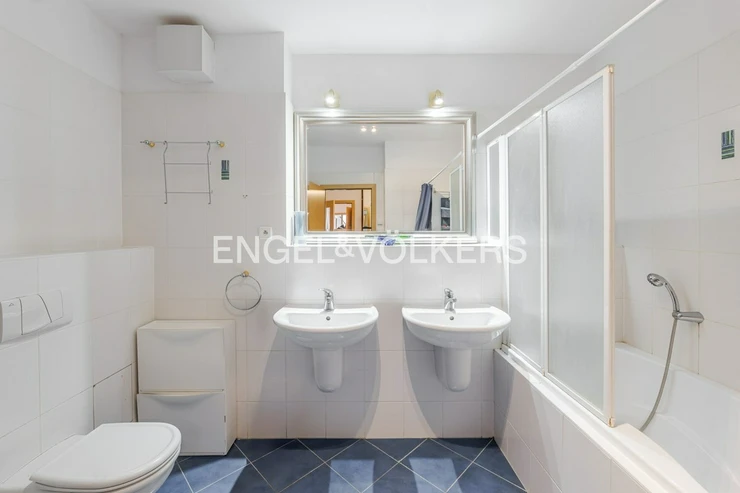 For extra comfort, the apartment offers two bathrooms, a separate toilet, and a practical dressing room. The purchase price includes garage parking and a cellar.