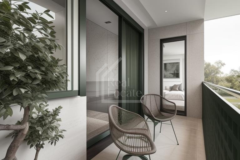 The apartment offers a spacious living room with a fully equipped kitchenette, a separate bedroom, and a modern bathroom. The equipment includes a white kitchen unit with appliances, high-quality flooring, and modern interior elements. The apartment includes a balcony that provides space for relaxation.