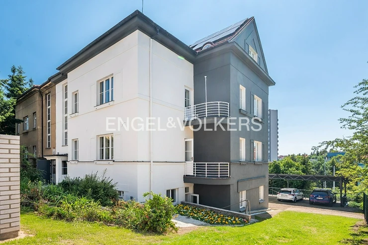 The building is located in the prestigious Hanspaulka residential district, known for its peaceful atmosphere and unique genius loci.