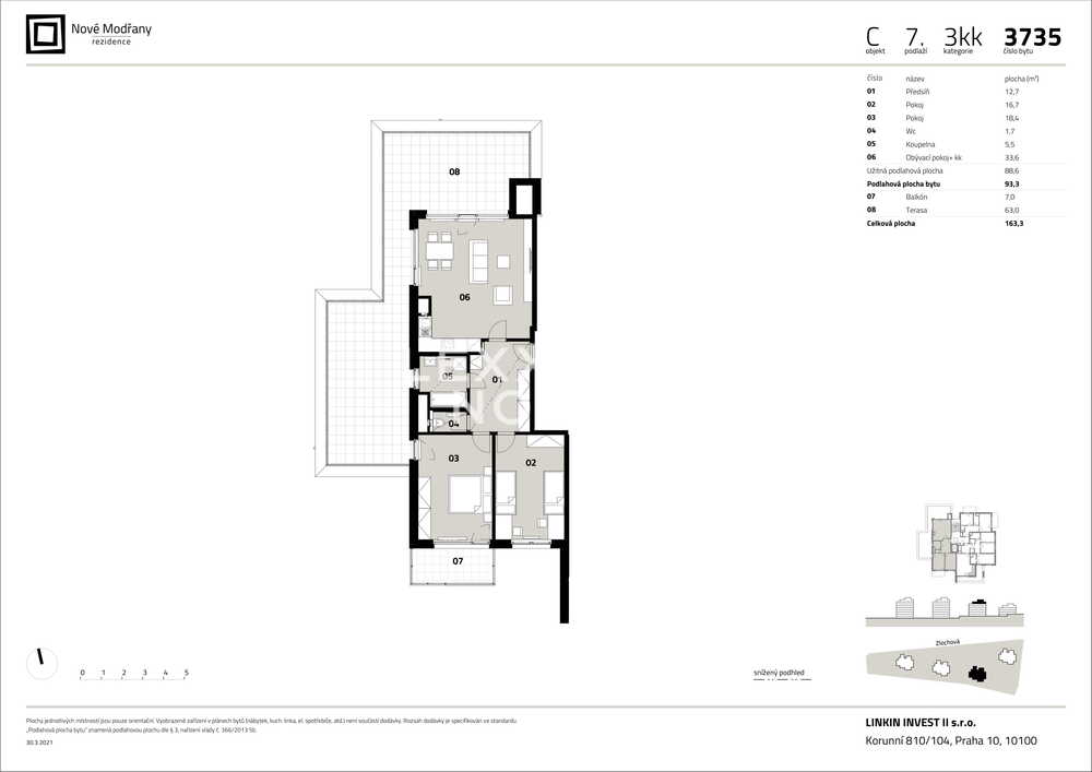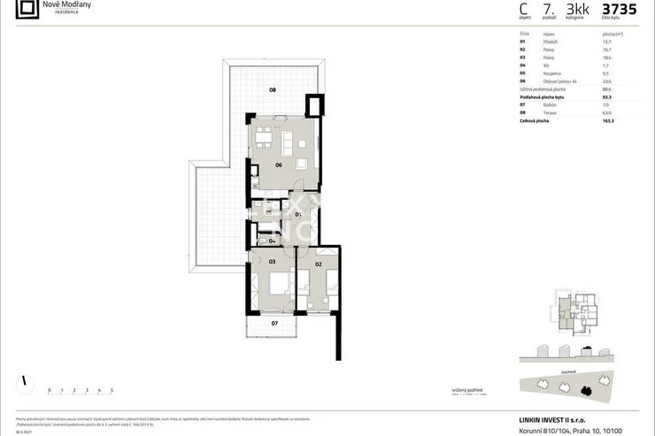Nove Modrany offers for sale a generous two bedroom apartment with a balcony. The apartment is located on the 6th floor of a modern residence, which is growing up in Modrany, Prague.The project has been approved, the apartments are immediately available for handover.Nove Modrany is a unique project that combines the comfort of a big city and the freedom of nature. The above-standard two bedroom apartment with a size of 93.2 sqm will enchant you with a balcony, which the developer has enlarged to connect the apartment with the surrounding greenery. The Nove Modrany project includes an outdoor gym, a cafe, 3 playgrounds with trampolines, and a park full of greenery on the east side. In the project you will also find a room for strollers, scooter stands and electric car chargers.Modrany is one of the lively districts of Prague. All you have to do is run down to the Vltava on the evening beach volleyball, get on a bike or just take a walk in the Modranska rokle. You can go shopping and ice cream on foot and you can arrange everything you need in Modrany. The tram from Modrany will take you to the center in a few minutes without a transfer, and the direct connection to the Prague ring road will seamlessly connect you with the D1 and other motorways.